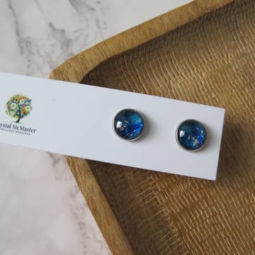 Our collection of Framed Studs are expertly crafted with nickel free hypoallergenic stainless steel bezels that frame unique faux stones. Professional quality polymer clay is blended with pigments and inks to achieve the desired shade, then mixed with foils, metals, and mica before being pressed and layered into slabs. Each individual stone is hand cut and secured into a frame, then baked at low temperatures. Finally, the earrings are washed, dried, and finished with a high gloss resin for a polished appearance or left buffed for a more natural look. Studs are then attached to a branded earring card with a hypoallergenic silicone backing. Studs are 10mm diameter and are extremely light weight