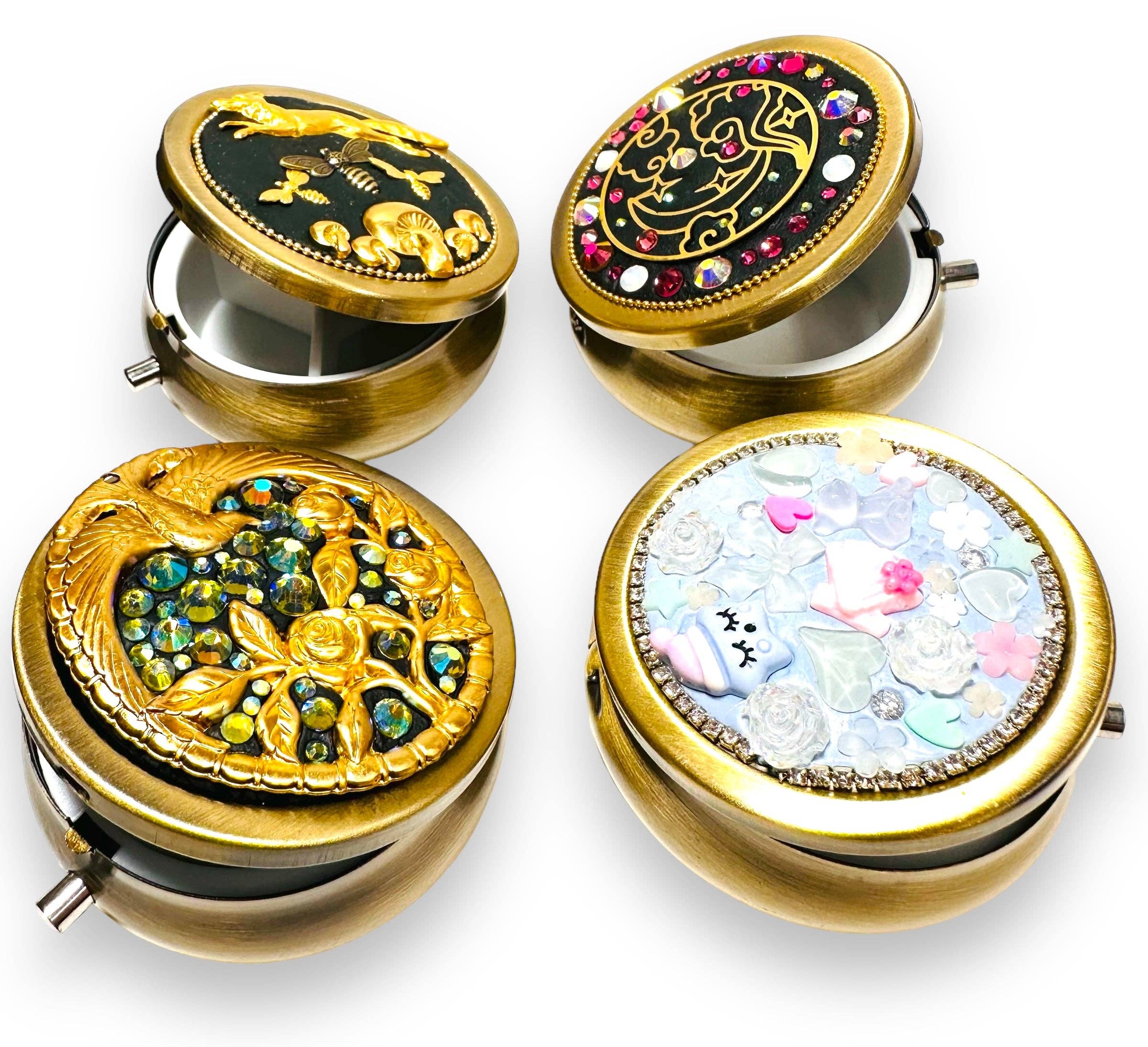 3”x1.5”x 1.5” lucite jewelry box. Hand decorated with glass and plastic gemstones and brass stamped butterfly. Faux pearls, brass, clay, Quartz crystal and moonstone. Decorated with faux “icing” glue.