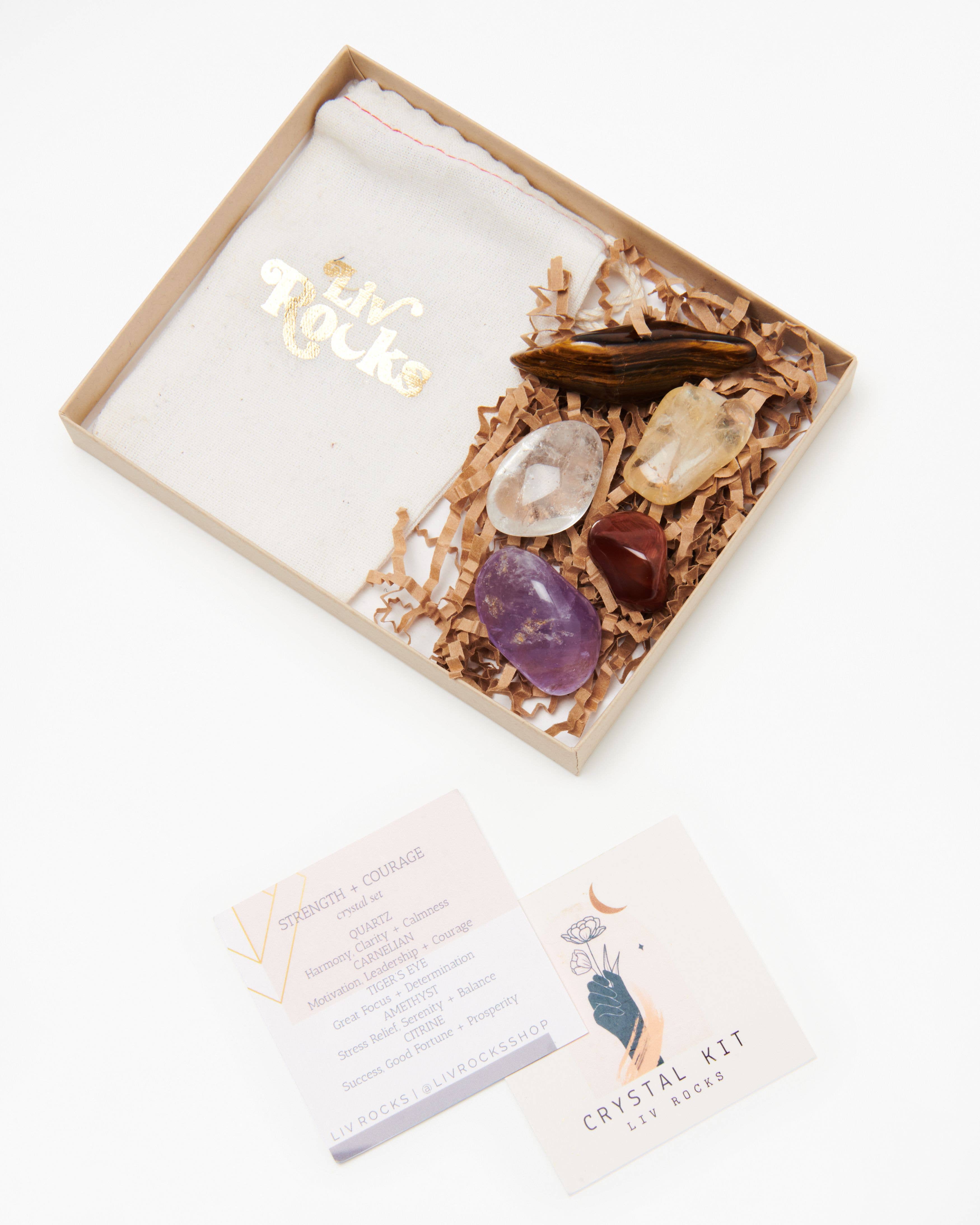 Crystal set of 10 genuine high quality stones essential for any collection. These are beautiful one inch stones in a combination of tumbled, rough, points, etc. My Crystal Guide, featuring images of each crystal and their properties, printed on full color on quality 4”x6” card stock is included in every crystal set. Each Beginner Crystal Set comes with a stamped cotton canvas pouch. You will receive one of each of the following: Clear Quartz Citrine Amethyst Selenite Black Tourmaline Rose Quartz Carnelian Green Aventurine Tiger’s Eye Smoky Quartz Featured in New York Magazine, Refinery29, Better Homes and Gardens and more.