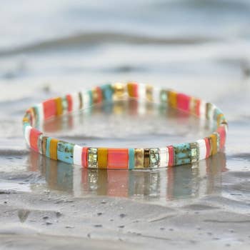Everyone needs to bring a bit of paradise into their every day. This bracelet will do just that! Featuring glossy white, turquoise, pinks and yellows.