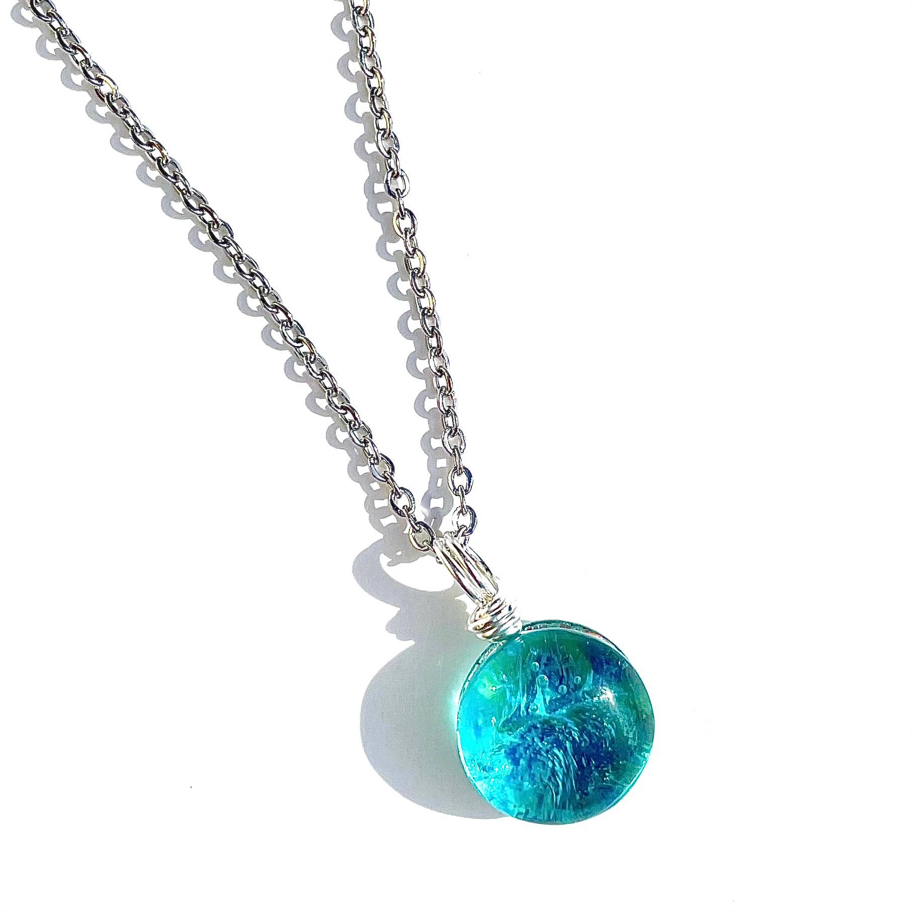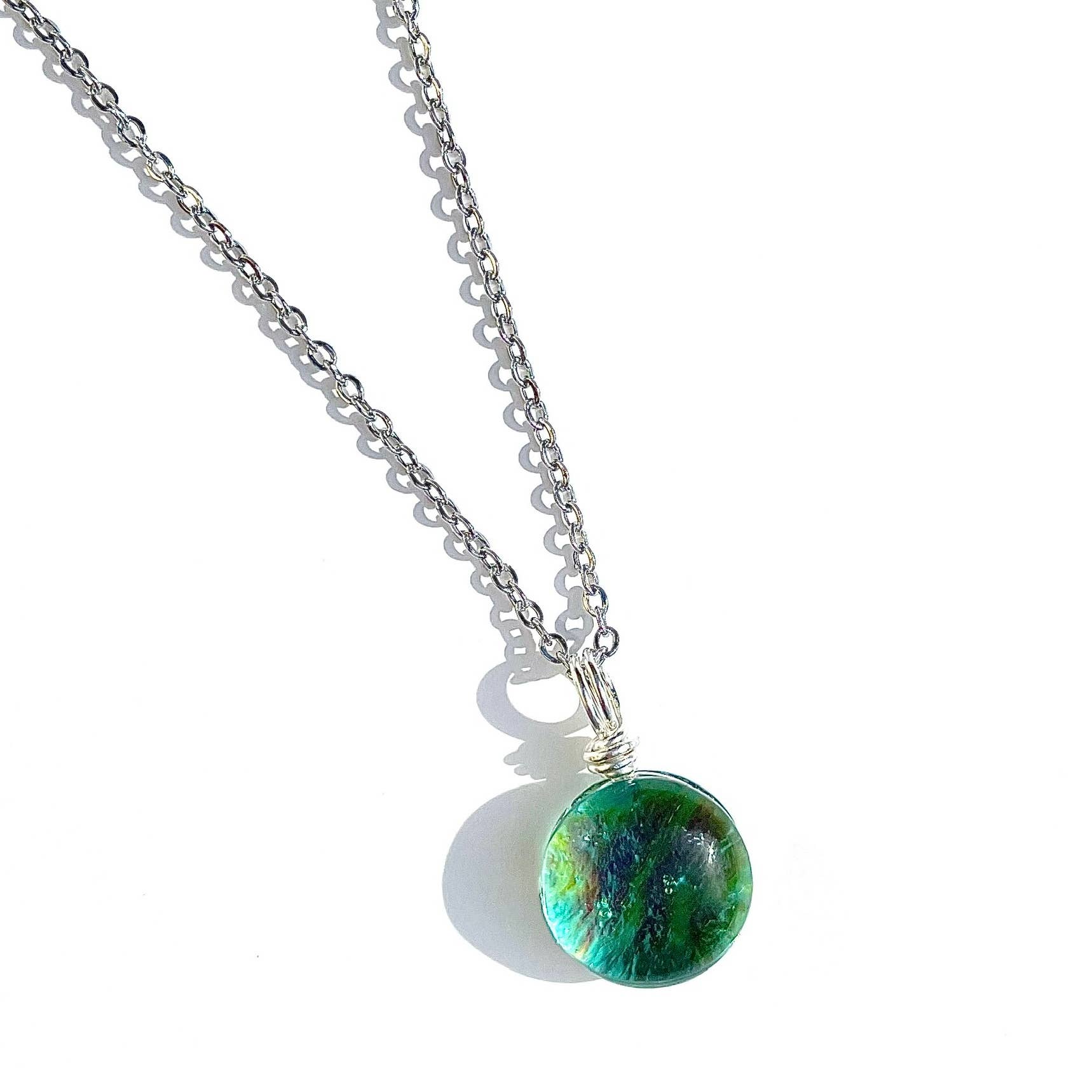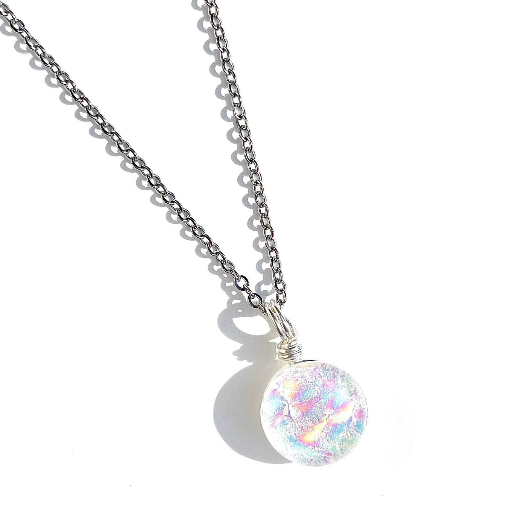 This unique light blue round Dichroic Pendant has been carefully handcrafted by the skillful artists Carolyn & Anthony Green, who live in Victoria, BC Canada. Each piece of artwork has been carefully designed and fashioned from start to finish using only the finest skills in glass craftsmanship. This is the perfect minimalist, yet statement pendant! Fused glass is a process of melting layers of glass together in a kiln at temperatures between 1350-1450 degrees Fahrenheit. When the glass has cooled down after 10-12 hours, we then grind the glass with a diamond bit to shape the piece. After, the glass is then fire polished and annealed in the kiln to make the glass smooth, shiny and durable. Each piece of glass goes through 2 to 3 kiln firings before it’s ready to be made into beautiful jewelry. This pendant’s slightly over 1cm in diameter. It is finished with a silver filled wire and comes on an 18 inch Stainless Steel Necklace on a custom birch wood display card.