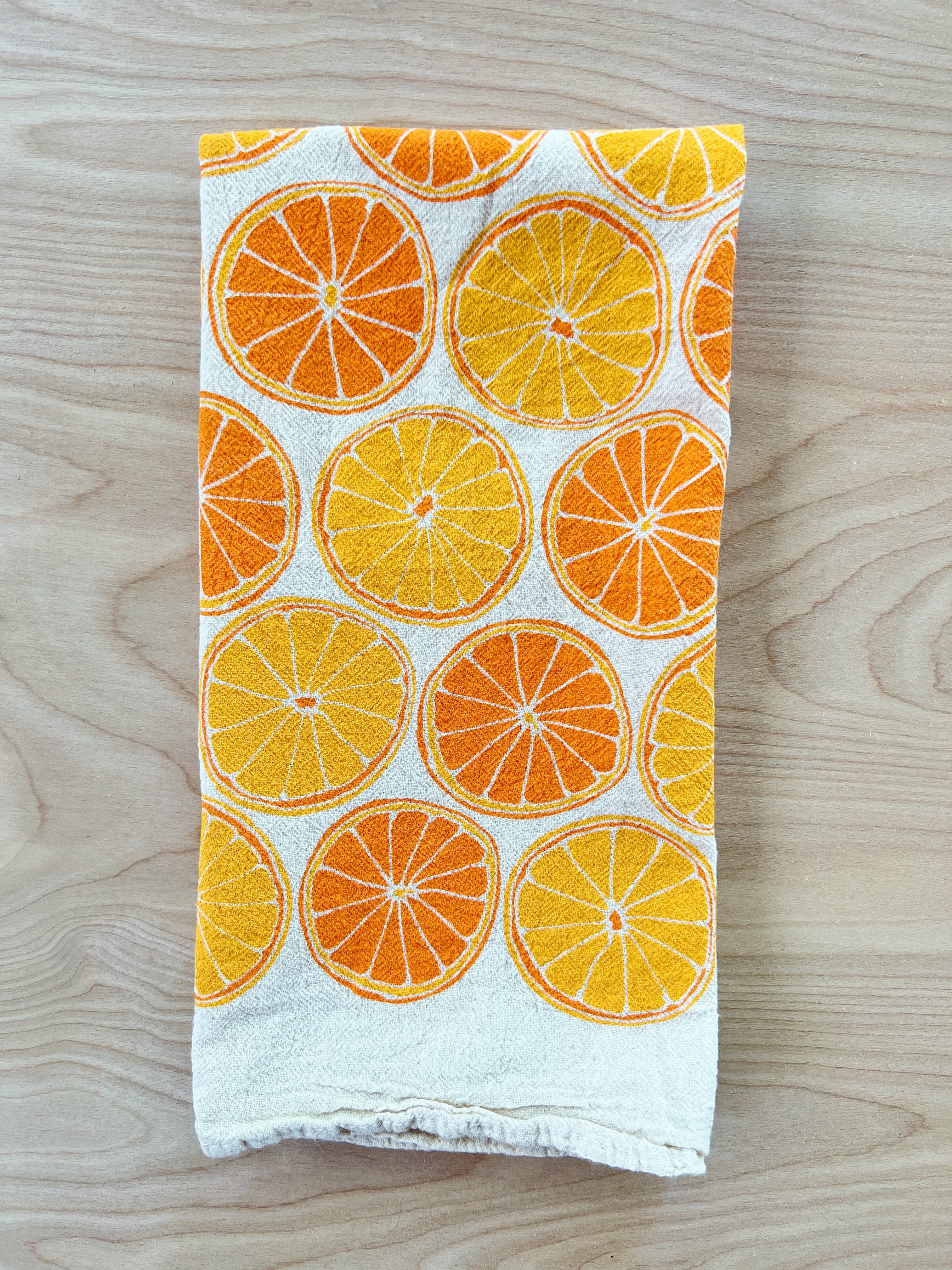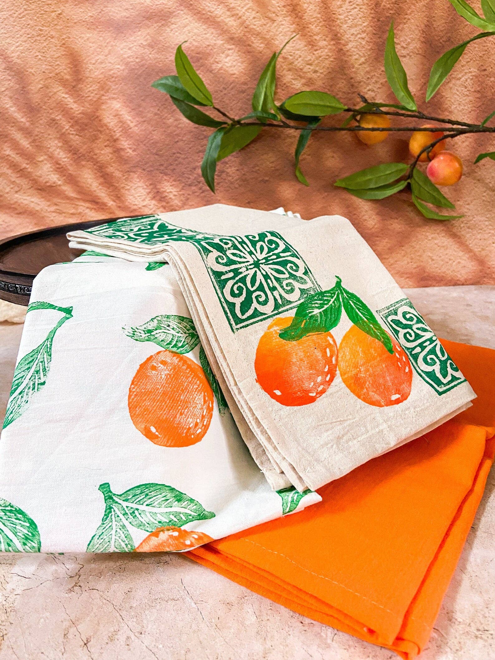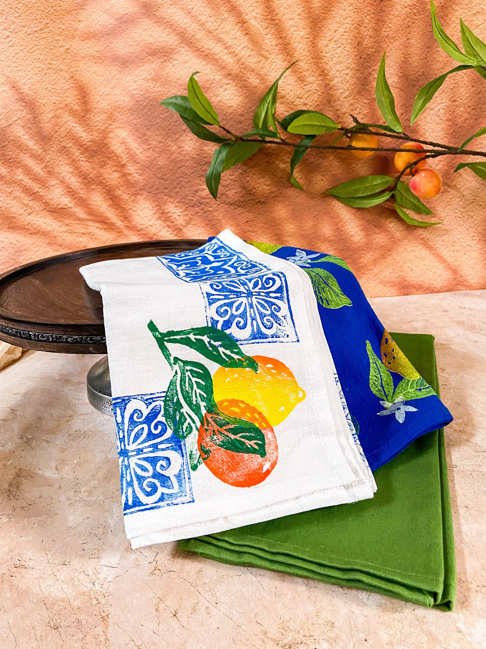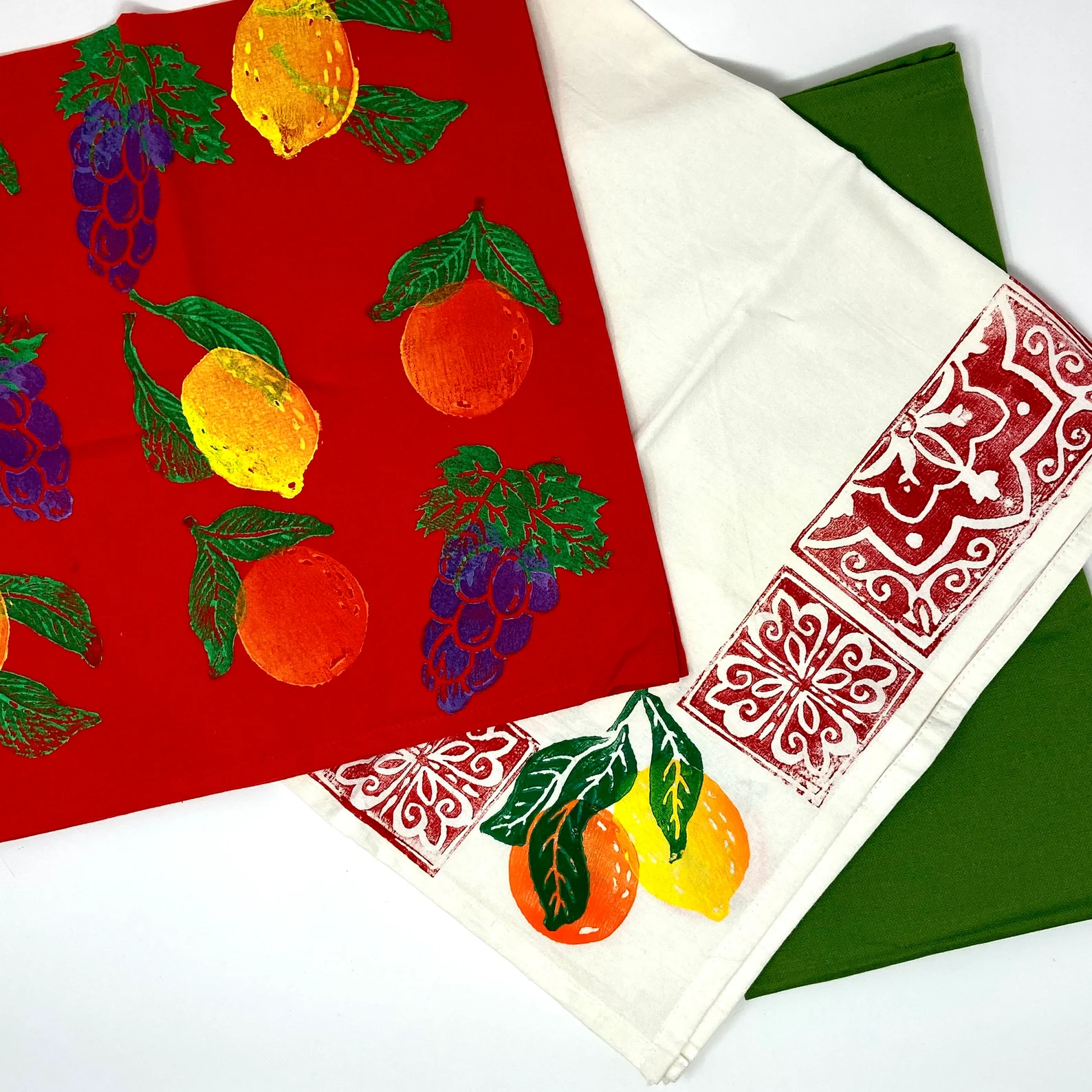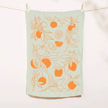 Inspired by the beauty of Thailand, these tea towels feature prints unique to the Thai culture. The first print is an all-over damask print, a traditional print that artisan block printers would make for saris and traditional clothing. The second print features the golden cassia tree, one of the most common blooms in Thailand grown in temples and used to splash water on Buddha. This gorgeous set will make an elegant addition to your kitchen or bar! This set includes 3 flour sack towels: 1 all-over-print with golden cassia blooms, 1 all-over-print with Thai damask, and a solid non-printed towel. Perfect for gifts, baking, and for bar use. FLOUR SACK TEA TOWELS SPECS: Towels Measure Different sizes. Printed towels measure 26"-28" squares; the unprinted towels measure approximately 20"x30". Care: Wash with cold water, tumble dry low Made from 100% Durable Cotton Corner Hook for Hanging Hand Printed in the USA Plastic-free and Recycled Packaging Limited Quantities