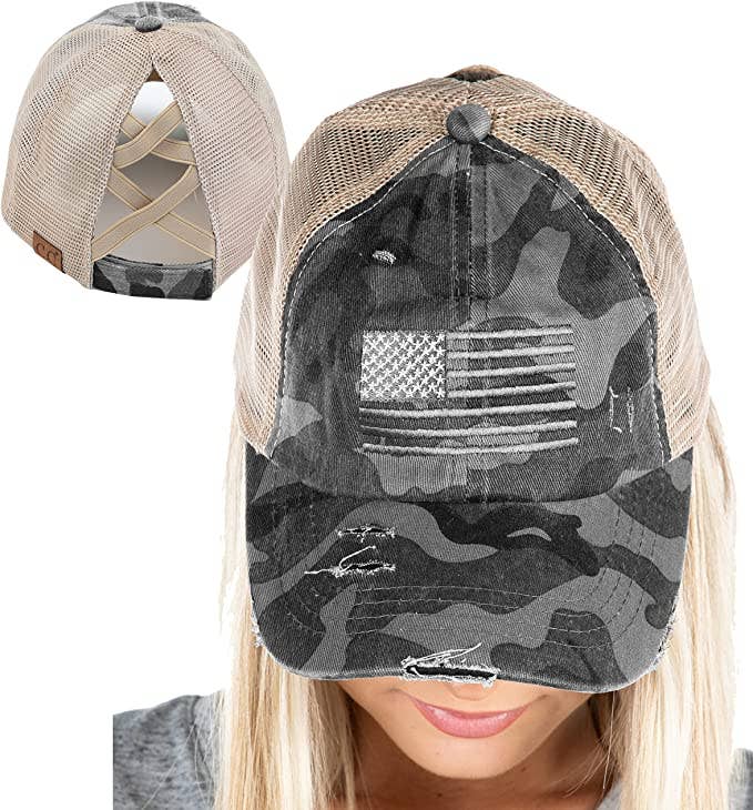 C.C American Flag Embroidery Camo and Mesh Back Baseball Cap 60% Cotton 40% Polyester One Size Made in China