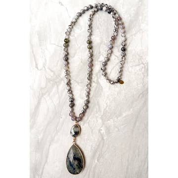 Adorn your neck with this gorgeous statement necklace, featuring faceted gemstones of clear quartz, labradorite, smoky quartz, and citrine, all with dazzling gold-plated accents. Length is adjustable from 18-20”.