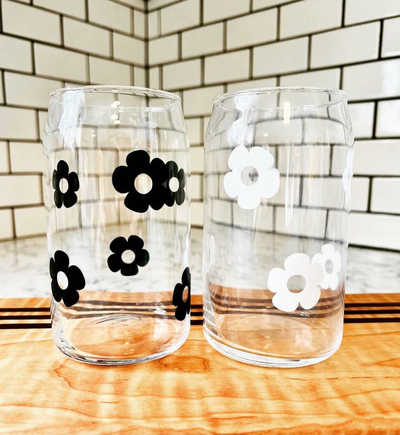 These beer can style glasses are great gifts for anyone! These beer can glasses are glass and hold approximately 16 ounces. The design on the glass is done in permanent adhesive vinyl. We recommend hand washing only.
