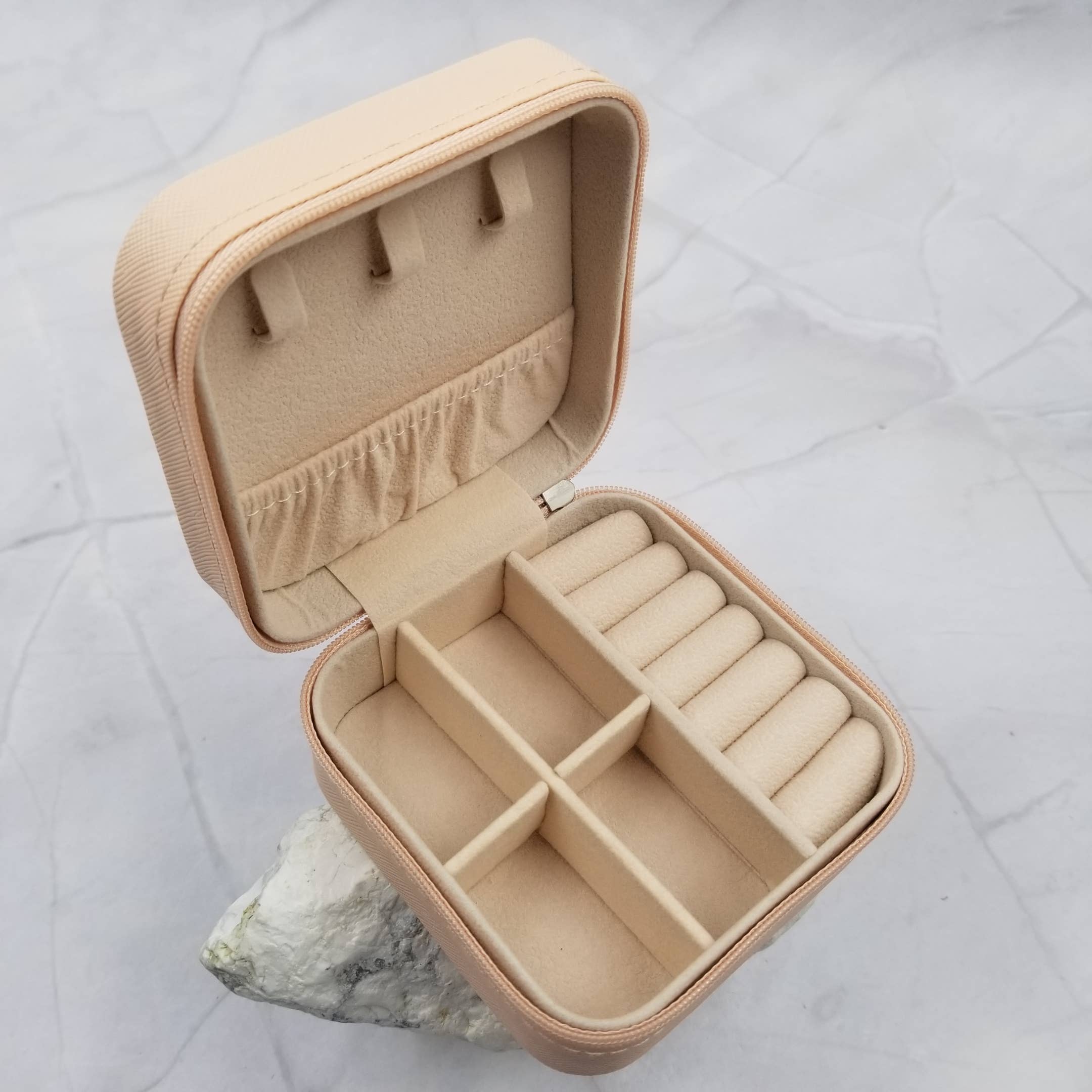 Heart Jewelry box with zipper Partition double layer design High quality leather material Suitable for earrings, bracelets, necklaces, and other jewelry Please note: Pink is textured leather Red is smooth leather Size 10CM * 10CM * 5CM