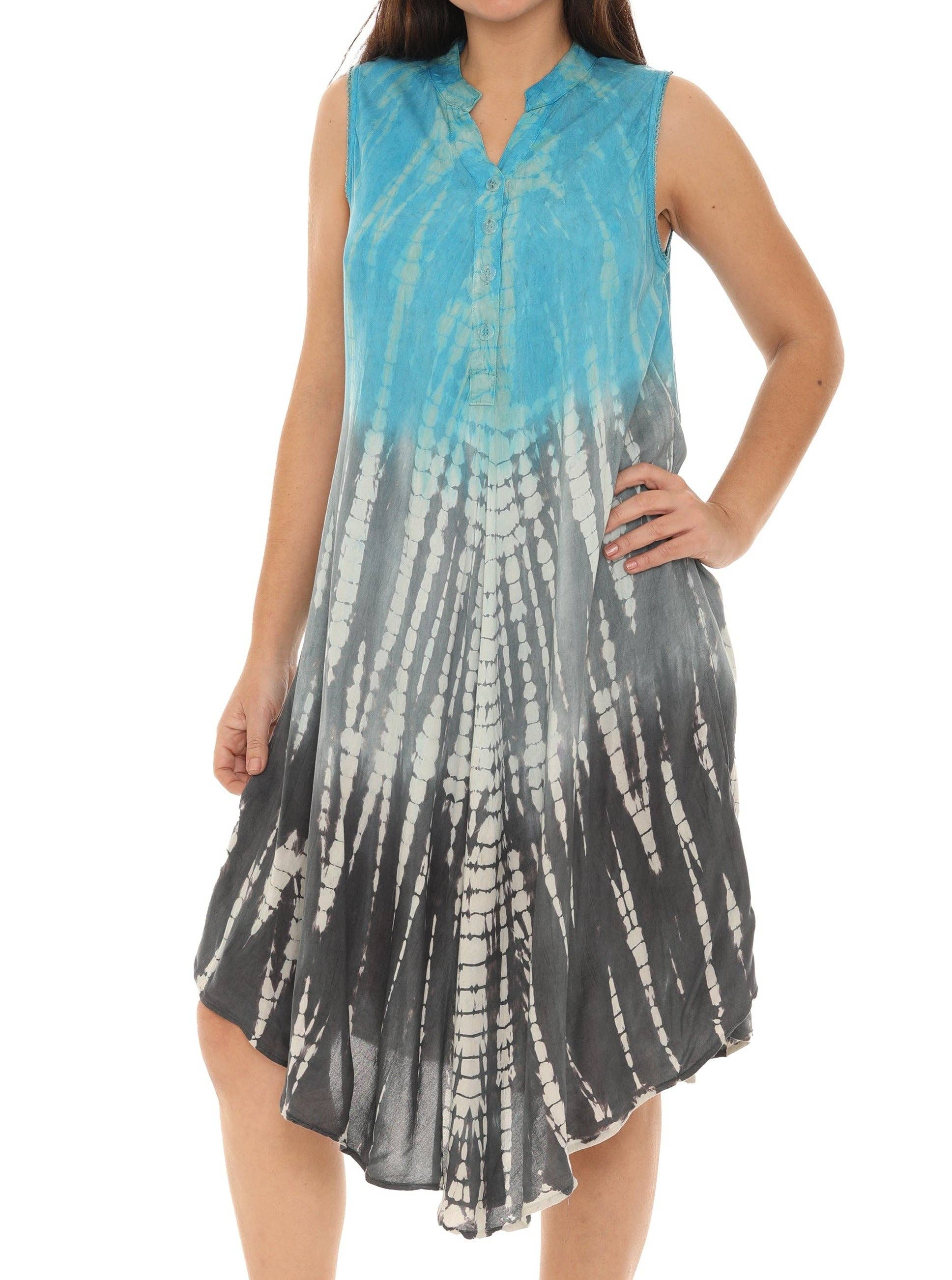 * Escort boho-chic appeal into your closet collection with this flowing shift dress showcasing a tri colors-dye print and easy, breezy sleeveless. The dress, made out of a breathable and super-soft rayon, is a true summertime staple thanks to its flowing design and boho-chic tie-dye. * Tri-tone Tie-dye Pattern Midi Rayon Dress * Sleeveless, Mandarin Neck * Button Up * Circle High-Low hem, Midi Length *