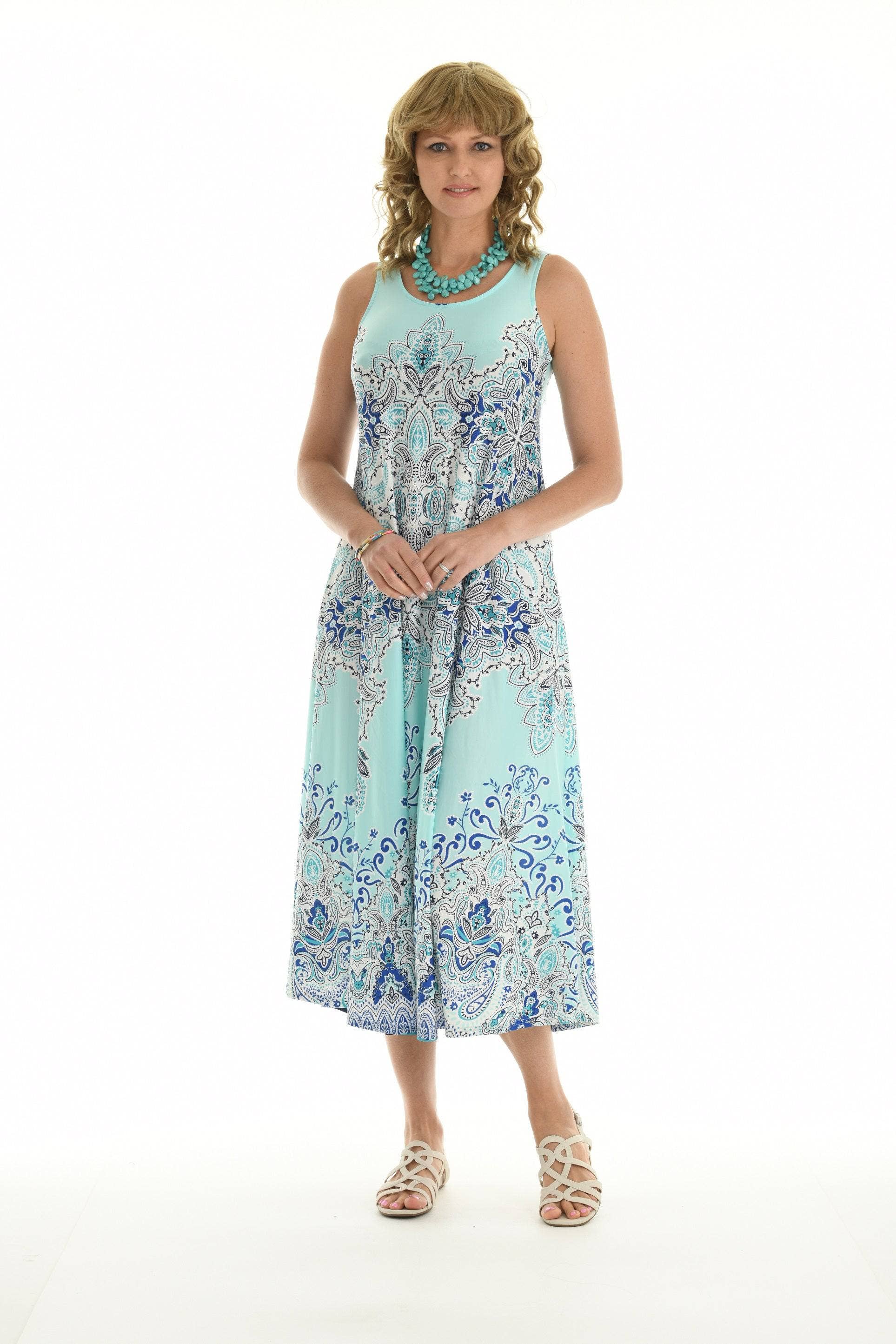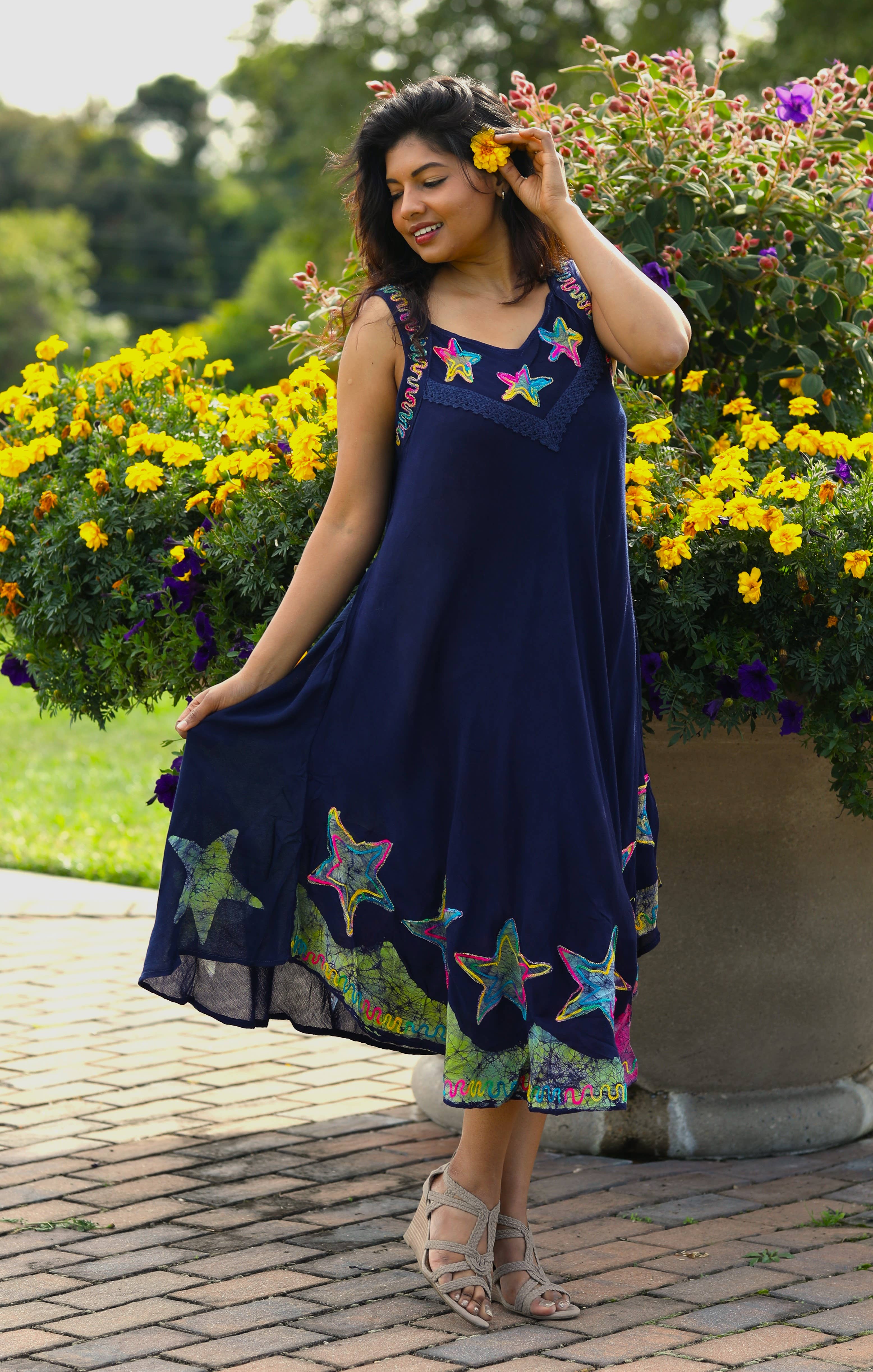 SKU: 215614 Made in India Care Instructions: Hand wash Dress Style: A-line Fabric: 100% RAYON Fit: Missy and Plus Size Pattern: Tie-dyed Season: Spring/Summer Skirt & Dress Length: Midi Sleeve Length: Sleeveless Weight: 311.84 g (11 oz)