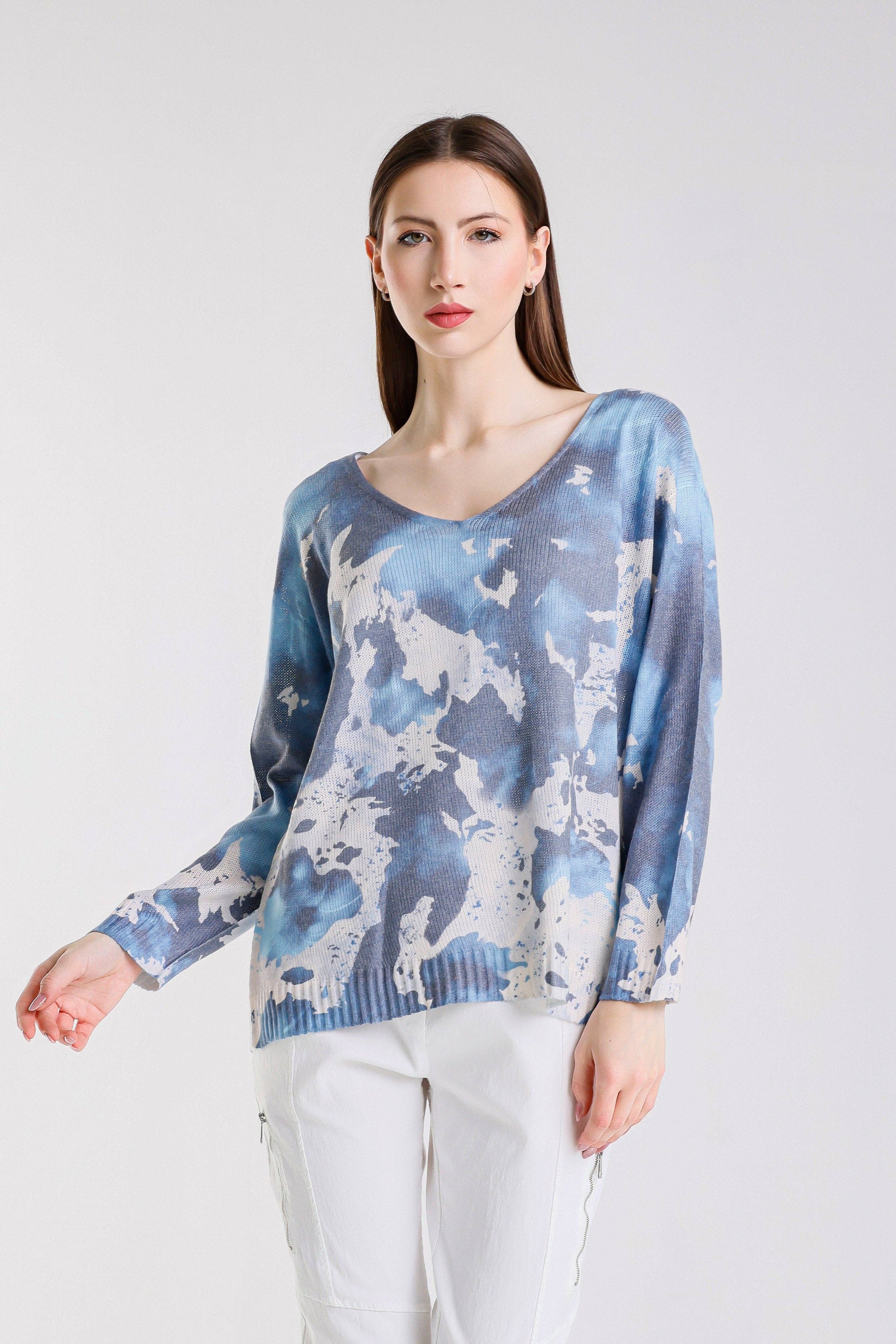 Z458 Blue Abstract Round Knit Printed Sweater LOOWIE One Size Made in Italy 62% Polyester 33% Viscose 5% Elastane