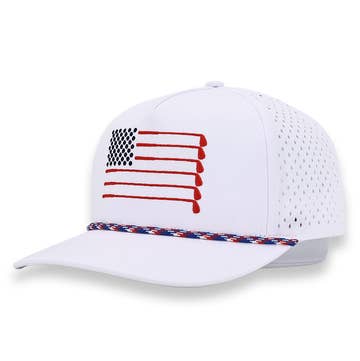 Golf Flag Rope Hat - Limited Edition. “The Classic and Original SwingJuice Golf Flag Hat. Americana at its Finest”. Adjustable 6 panel, unstructured mid-crown crown silhouette. High quality active poly material. Premium cotton cord and woven label patch secured with satin stitch.
