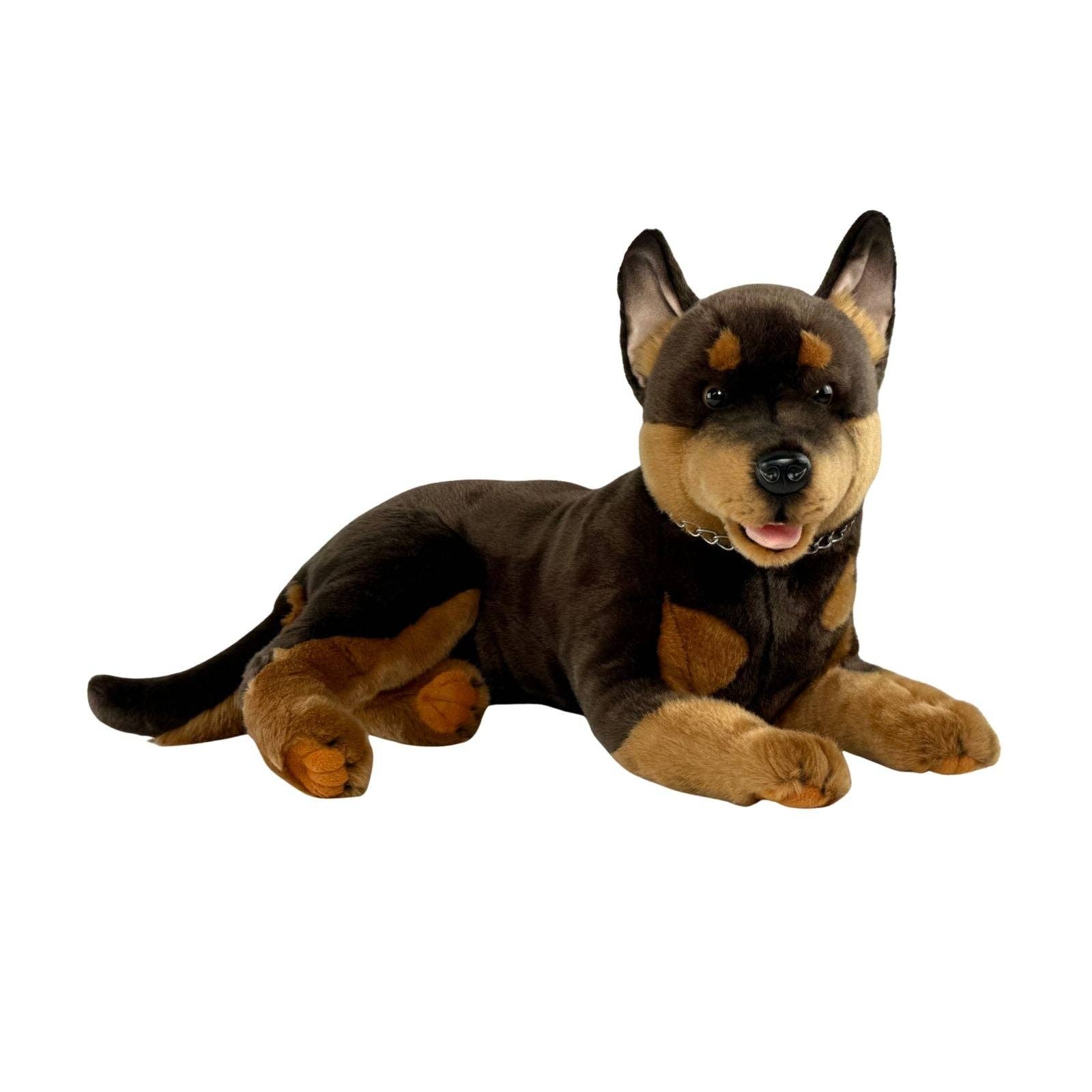 Caesar is a really cute realistic large-sized german shepherd plush toy, a handmade and airbrushed stuffed animal. The breed was officially known as the Alsatian until 1977 when its name was changed back to German Shepherd. The German shepherd is a common breed used as a police dog (also known as a K-9 or K9 dogs). These dogs are specifically trained to assist police and other law-enforcement personnel and are excellent in searching for drugs and explosives, locating missing people, finding crime scene evidence, and attacking people targeted by the police. Caesar measures 67cm/26.3″ from the tail to the front of his paw, or 56cm/22″ from his torso to his head, 22cm/8.6″ in width and 32cm/12.5″ in height or 40cm/15.7″ to the top of the ears. The stuffing for Caesar was made using 49 recycled plastic bottles from regenerated ocean waste. * Great as an educational toy for this iconic K9 police dog * Excellent unique gift idea * Preferred alternative to companion robotic pets to comfort lonely seniors, aged-care residents and Dementia patients being fully machine-washable, soft enough all over to be cuddled in bed and so much more affordable * Transitional therapy lovey toy * Can be converted to a weighted toy or a graduation teddy * Ethically manufactured sustainable toy * Custom and corporate branding * Lifelike replacement for a pet that has been lost * Great as an ESSA – Emotional Support Stuffed Animal, providing comfort for people suffering from stress, anxiety, depression, PTSD, Autism and other mental health challenges * Made using the highest quality acrylic fur * Made using 100% recycled stuffing * Eco-friendly * Ocean-conscious * Machine washable using chemical/soap-free cleaning agent * Great mascot or corporate gift * Can be brushed using a regular pet brush * Suitable for ages 3+ * May be claimed under NDIS - 0103 Assistive Products for Personal Care and Safety (Code# 03-040000919-0103-1-1) or 0112 Assistive Equipment for Recreation. * Shipping weight: 0.96 kg * Barcode: 8993462119576 * SKU: 505/64
