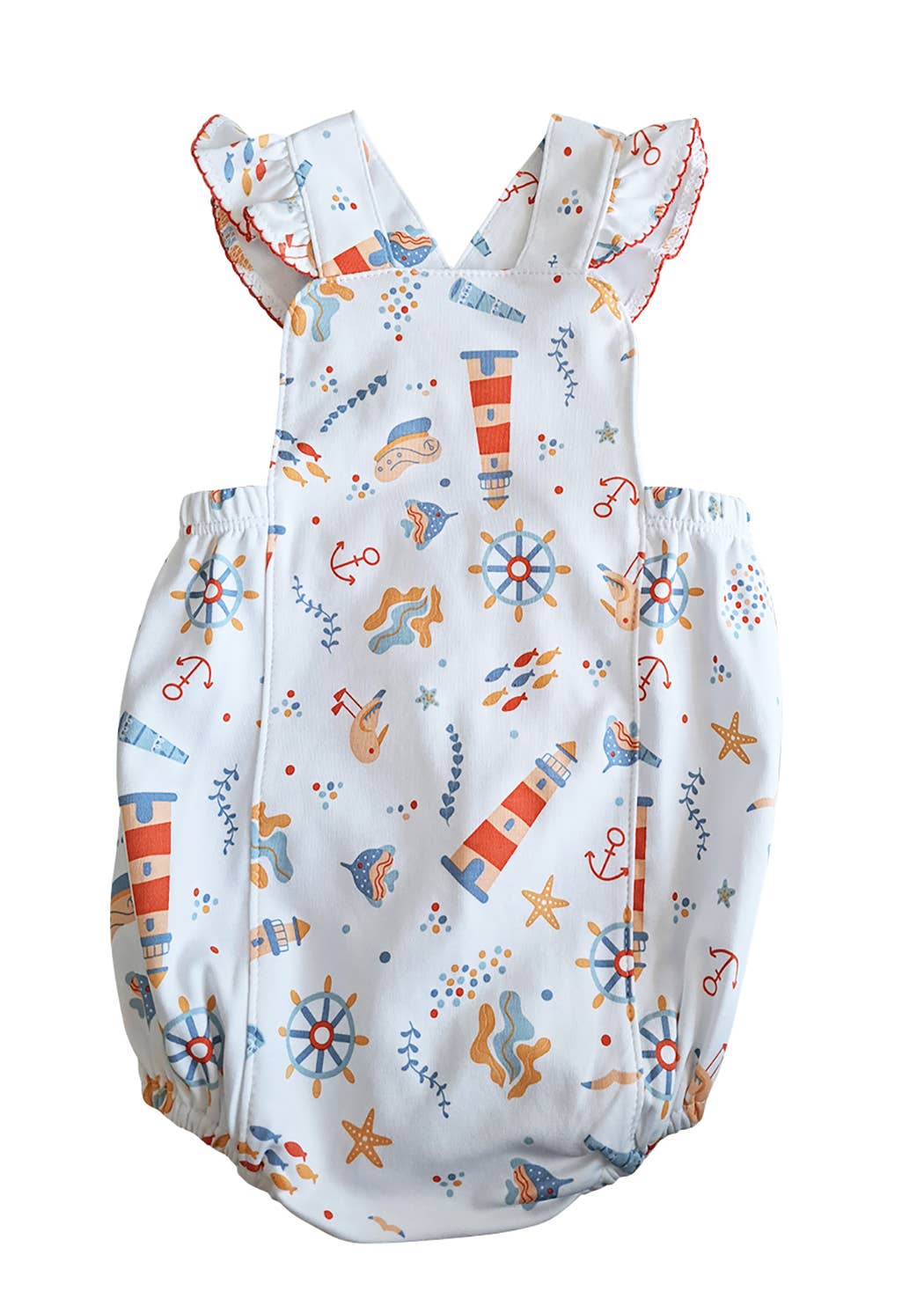 A must have for this summer time. Your little one will enjoy all the summer time activities in this onesie featuring our print with blue anchors and polka dots. In the center of the onesie is an embroidered pocket. The pocket has an embroidered sailboat. The onesie has straps that button in the front and crisscross in the back. Machine wash, tumble dry Imported Embroidered 100% Cotton