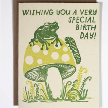 Smiling fluorescent flowers wish you a happy birthday! Letterpress printed by hand, using photopolymer plates from an original design. We print everything by hand in our studio, using antique equipment and eco friendly practices. Comes with an envelope. Blank inside. Handprinted, one piece of paper and one color at a time, in a small 2-person studio just outside of Asheville, North Carolina, on vintage letterpress equipment, using eco-friendly practices, American made paper, compostable plastic sleeves (when possible). We are truly a teeny-tiny operation and appreciate every order!