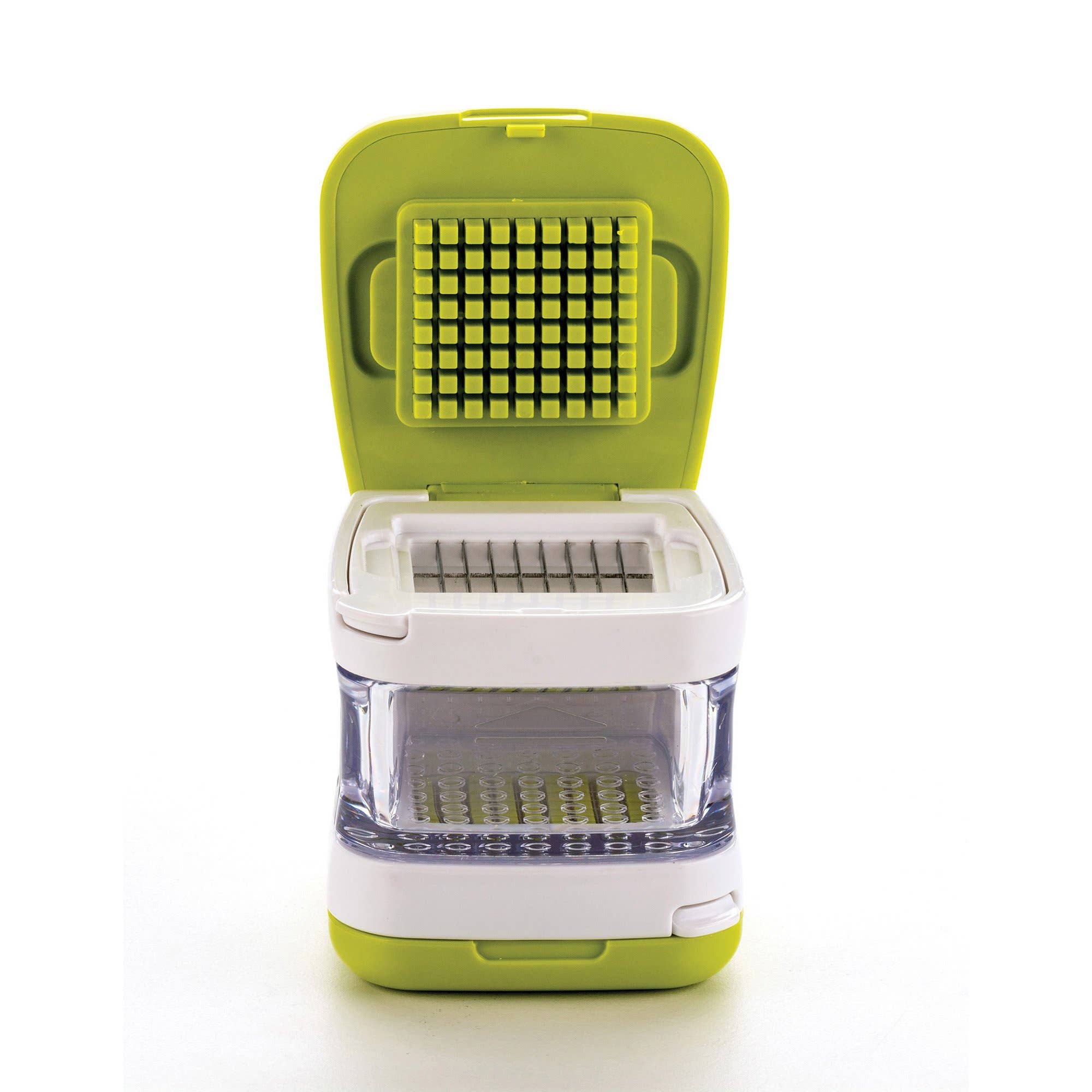 A multifunctional kitchen tool that can mince all kinds of ingredients, from garlic to ginger, herbs, nuts, and more! No more messy garlic presses, squashing garlic with rockers, or rolling garlic to peel! Patented design helps gather ingredients into neat triangles for easy removal (see video). Mincing teeth are beveled in both directions for more efficient cutting. A larger interior chamber can accommodate more garlic and other ingredients than the traditional garlic tools. Made in the USA with high-grade polycarbonate plastic, backed by a lifetime guarantee. *Please note that your order will consist of 12 clear, 7 green, 5 purple totaling 24 units.