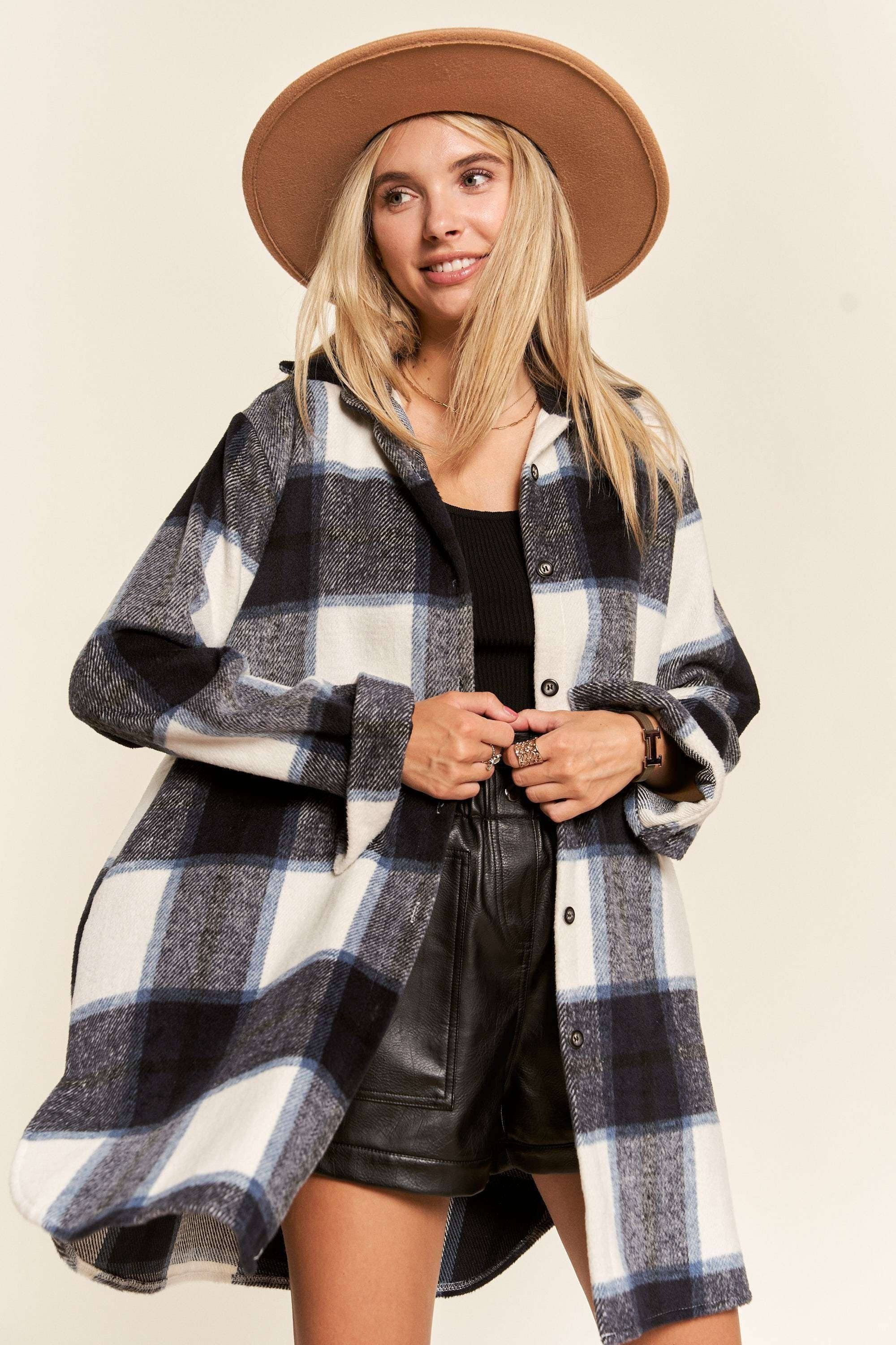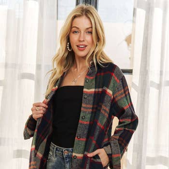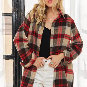 plaid print long sleeve button up shacket