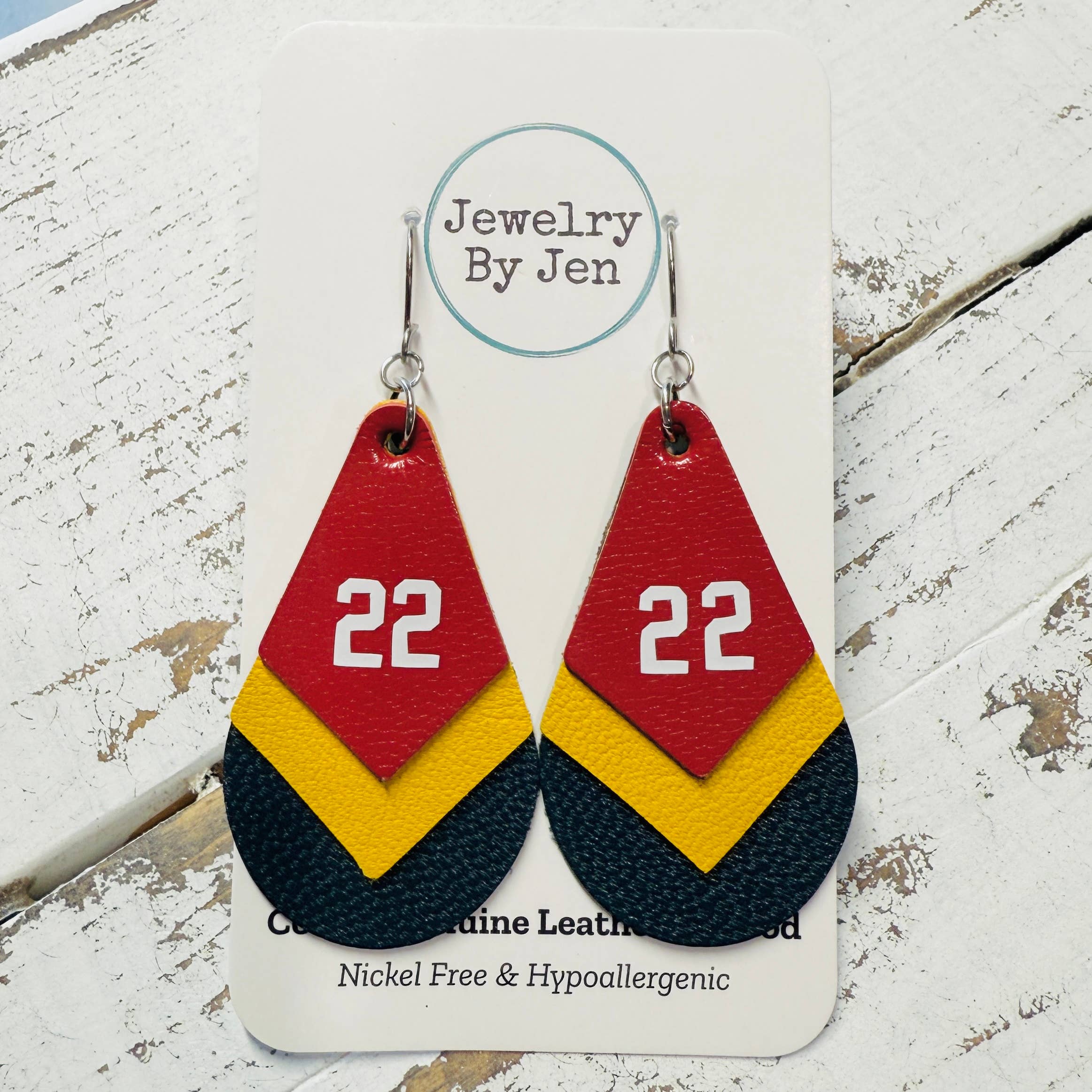 Red and Yellow layered teardrop with KC cut out on one side and our hero’s number 15 on the other side. Mediums are 3 in. long. Hooks are nickel free and silver.