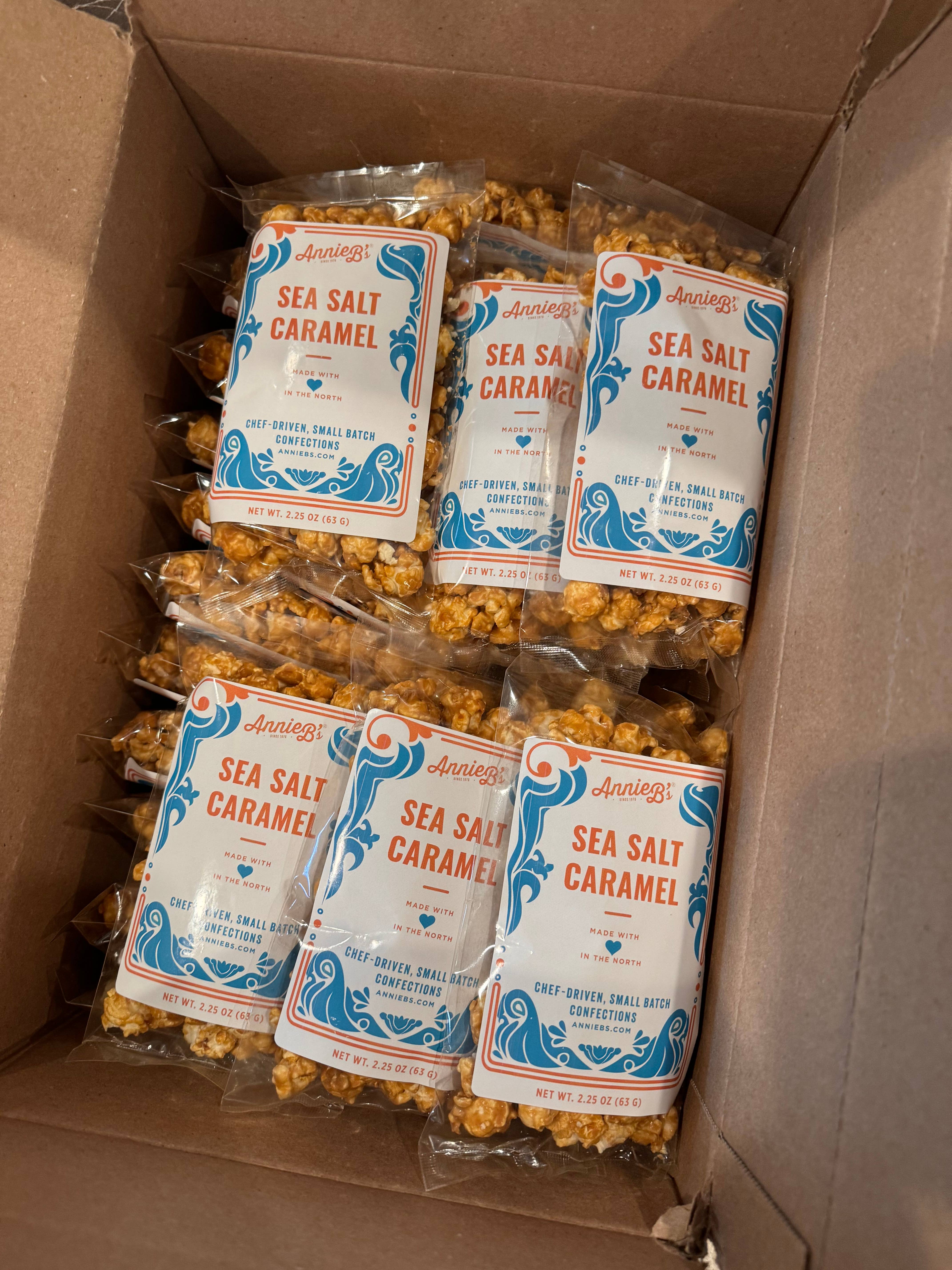 Annie B’s popcorn is popped and packed to order, so it’s always fresh and delicious. Our popcorn is made with non-GMO popcorn and is handcrafted in small batches in our facility. Sharp Cheddar Popcorn - Our light crispy butterfly kernel covered in sharp cheddar cheese goodness from Wisconsin. Original Caramel Popcorn - Our best-selling popcorn is composed of super-popped fluffy kernels glazed with our buttery caramel. Triple Treat Popcorn - Yum! Our Triple Treat popcorn is a perfect combination of salted white popcorn, caramel popcorn, and sharp cheddar popcorn. Sea Salt Caramel Popcorn - Ahoy, mate! If your taste buds are seeking a seaworthy adventure, look no further than our Sea Salt Caramel popcorn.