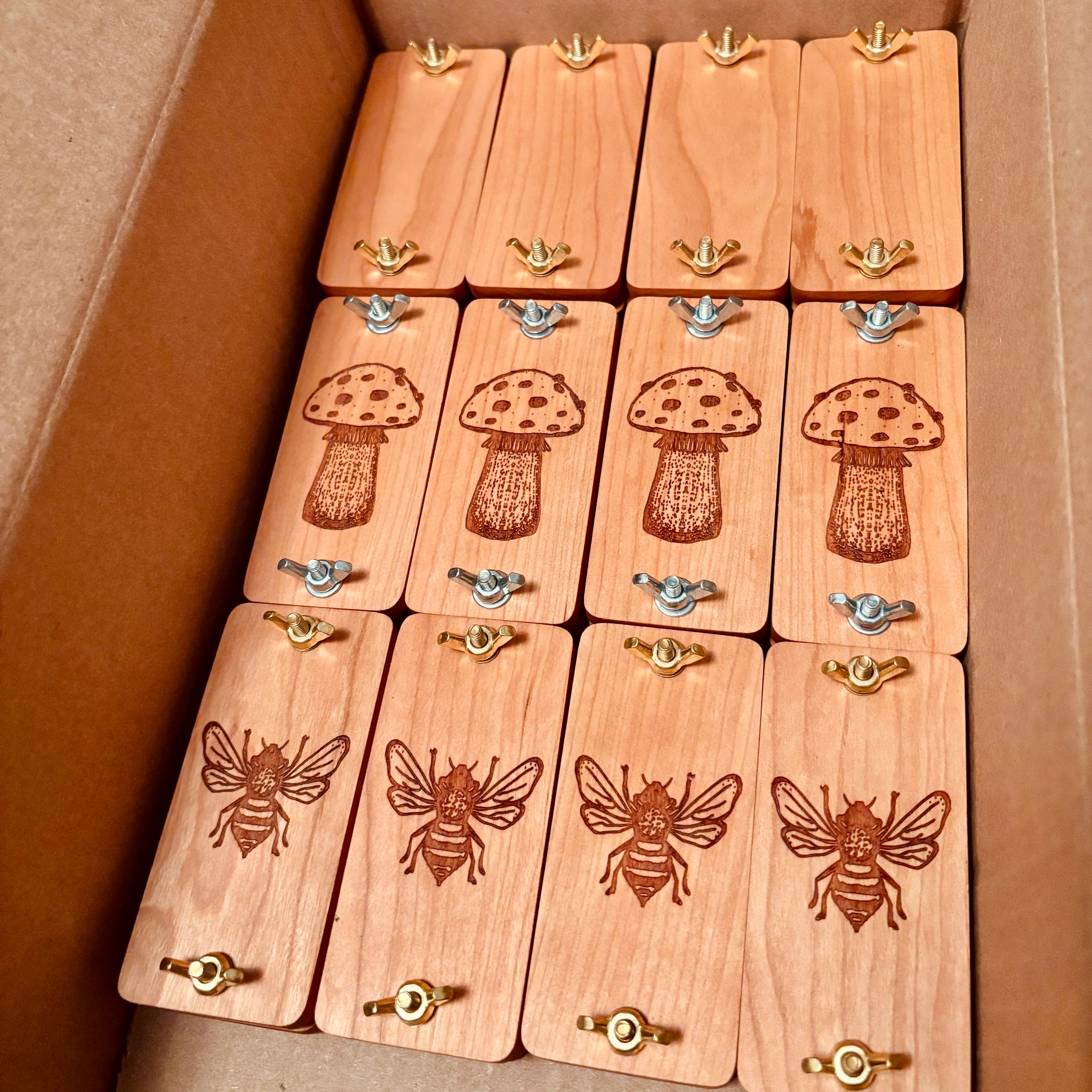 Flower presses are a wonderful way to enjoy nature and preserve it's beauty. Our pocket flower press features an original hand-drawn bee design and is the perfect size for tucking away in your pocket or a small bag you may take on a nature walk or trip away from home. It would make an excellent gift for any flower or nature lover and are perfect for pressing small flowers or clovers. Our flower presses are made from hand-selected hardwood sourced locally here in Central Michigan. This press is our smallest in size measuring 2" x 4" with 1.25" bolts making them ideal for pressing 1-3 small flowers or a couple of clovers. All presses are made by hand and coated in an oil finish for preservation. Due to the handmade nature of our presses each will have slight natural variations from the presses in the listing photos Each Flower Press Kit will include: (1) HARDWOOD FLOWER PRESS (POCKET SIZE) (2"x4") (3) Cardboard Inserts (1) INSTRUCTION CARD (8) PIECES of reusable blotting paper