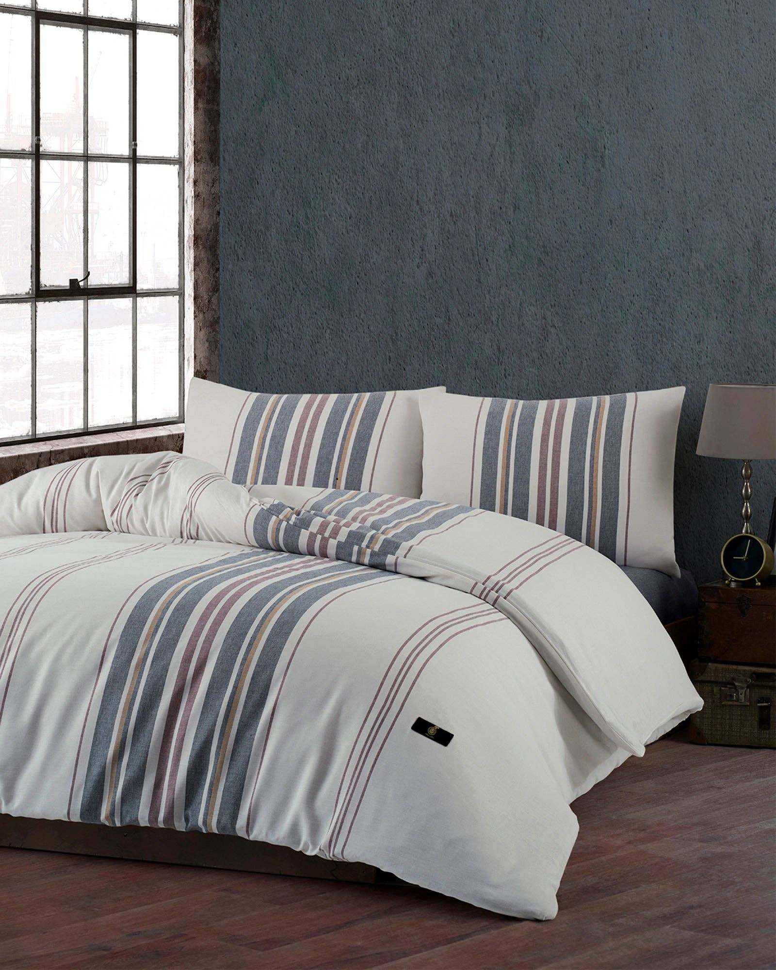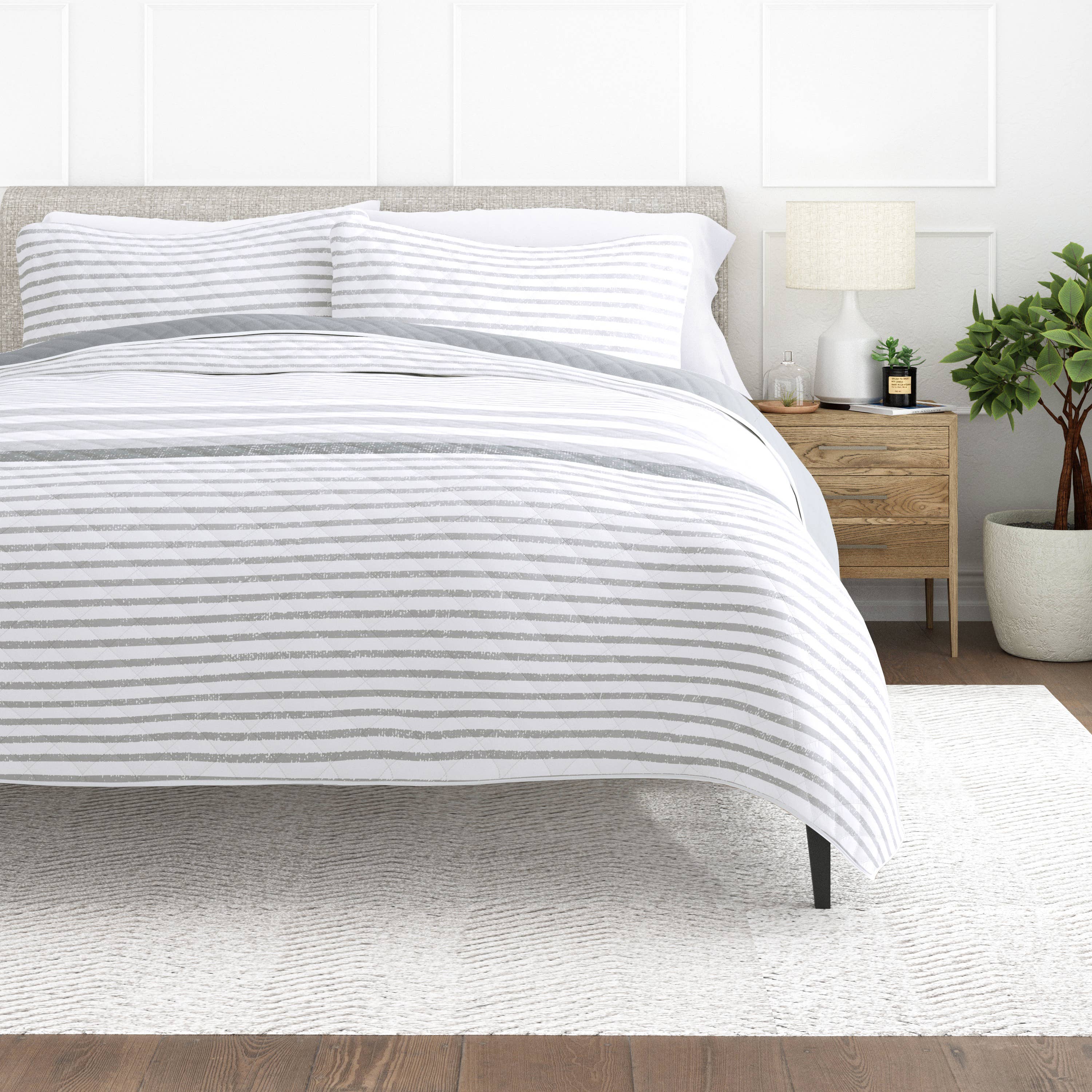 Revamp your bedroom style with this bed in a bag set which features a stripe pattern in alternating coral, white, and aqua colors that's pair with a solid grey reverse to create a casual vibe. The included sheet set has a coordinating stripe design to complement the soft and cozy comforter's look. Included in the set is 1 comforter, 2 shams (1 in Twin), 1 flat sheet, 1 fitted sheet, and 2 pillowcases (1 in Twin). The fitted sheet fits up to 14"(12"for Twin size) mattress depth. This bedding set is OEKO-TEX certified and features an antimicrobial treatment, which inhibits bacteria growth and keeps the bedding fresher for longer. • Soft brushed microfiber print comforter and shams; 100% Polyester filling • Machine washable. Commercial washer and dryer recommended to provide ample room for movement • Items may come in compressed packaging to ensure efficient shipping • Items will need to be fluffed up and steam ironed if compressed