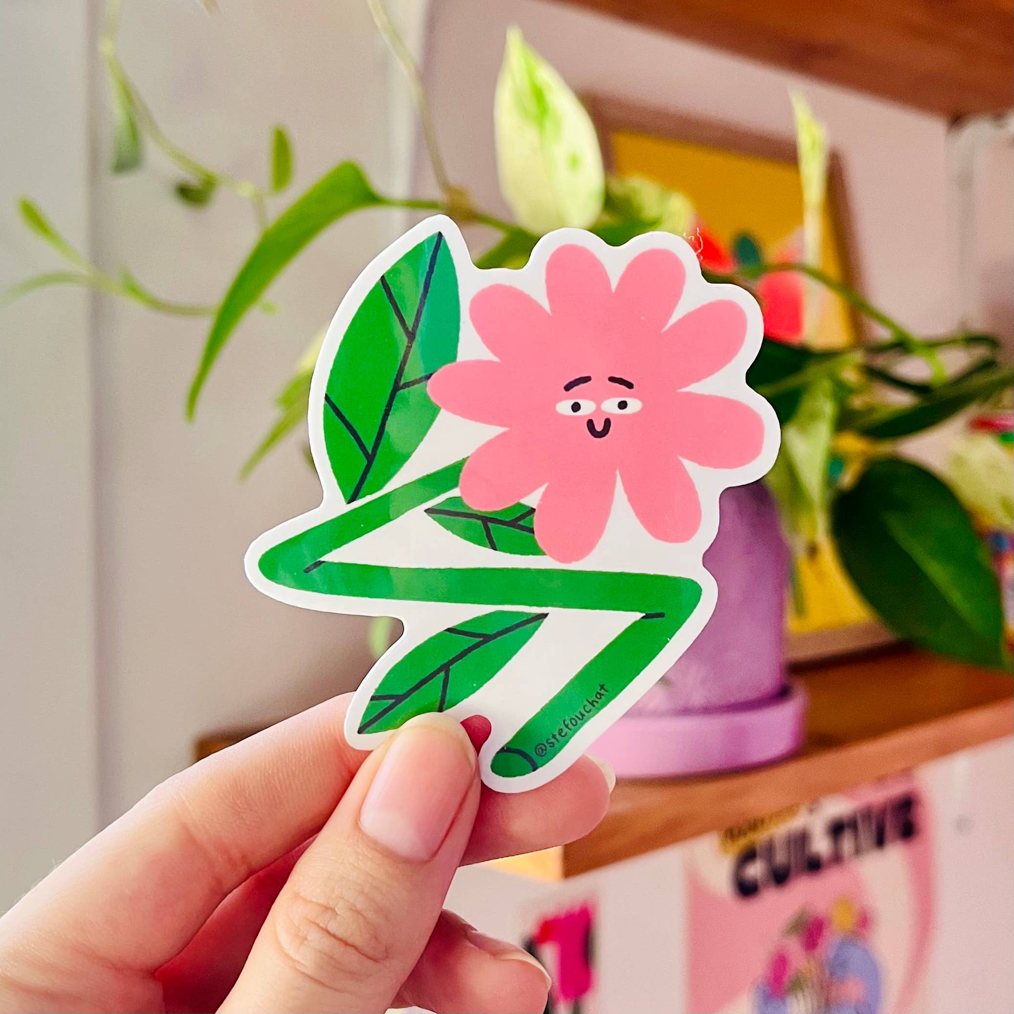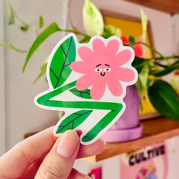 The Stromanthe Triostar Plant Girl Sticker features a hand-illustrated original design of a girl sitting on the rim of a dusty-pink pot that holds a pink-and-green-striped plant called the stromanthe triostar. This design was inspired by a recent trip to my local plant store!