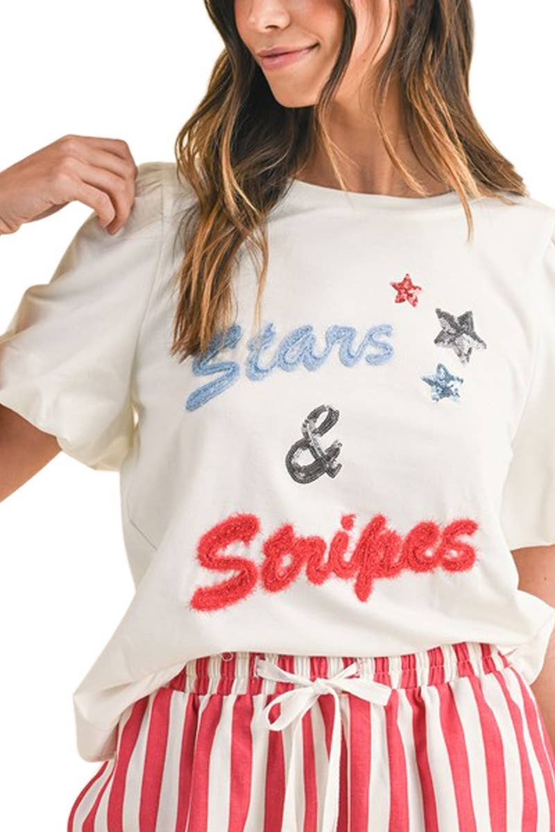 - Crew neckline - Star sequin detail - Casual drop shoulder - Short-sleeves - 100% cotton knit T-shirt top. - High-quality, lightweight, and breathable - Comfortable, Relaxed fit - 4th of July, July Fourth, Holiday, Graphic - Core * Model is 5'8, 32-27-37, wearing SMALL