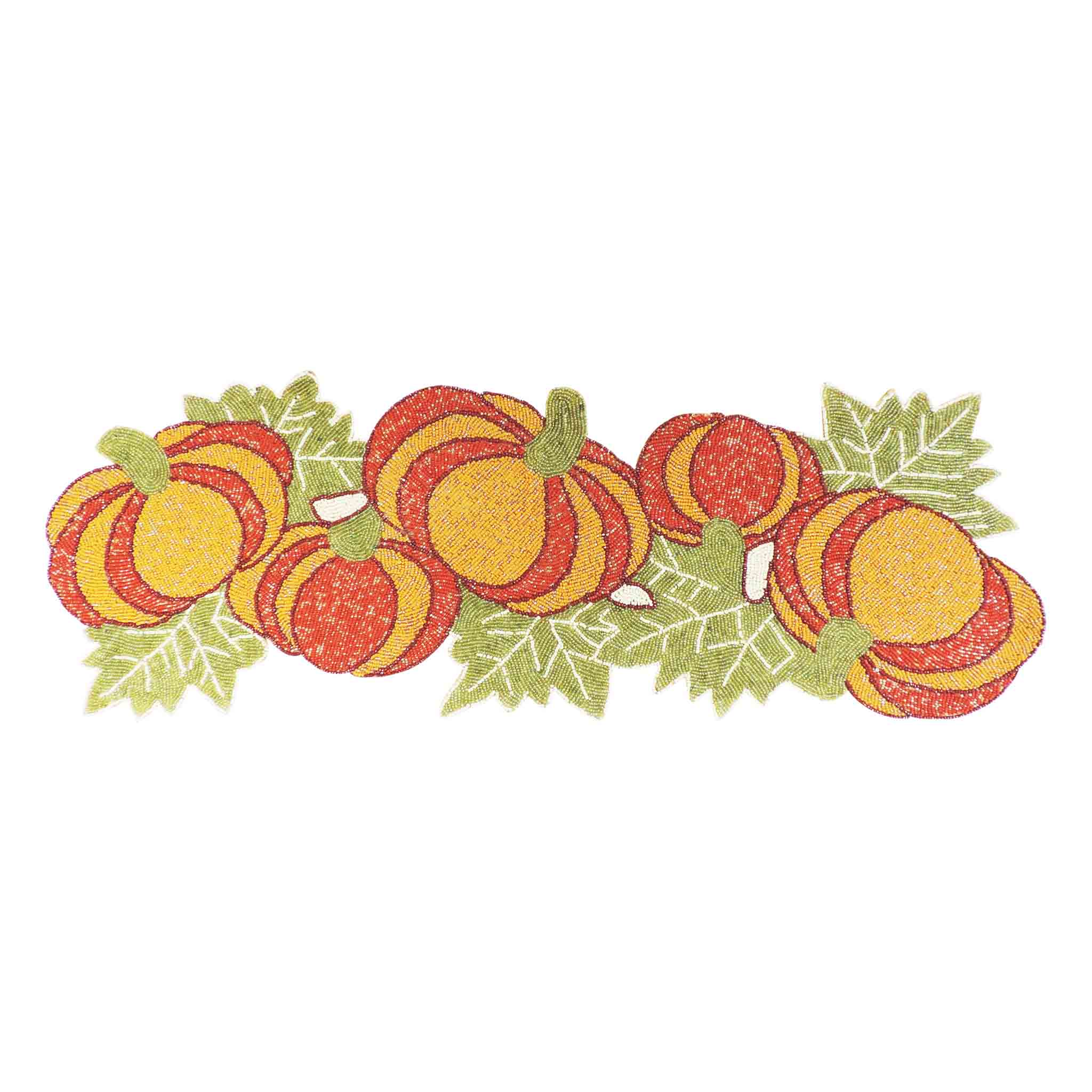 Our Table Runners are intricately hand embroidered using vividly hued glass beads. A generous 35 inch by 12.5 inch and weighing over 2 1/2 pounds each, these Table Runners are carefully finish with a poly-satin back to protect your table top finish. - Pieces in Set: 1 - Color: Orange, Green, Natural Gold - Size: 36" x 13" - Theme: Everyday, Fall, Autumn, Thanksgiving Holiday - Hand Made in India - Easy Care: Wipe with DAMP soft cloth or sponge - Materials: Glass Beads and poly-satin One of the most visually stunning forms of Indian artistry is traditional bead embroidery. Our Table Runners will add an elegant touch to any table and make you the envy of your guests!