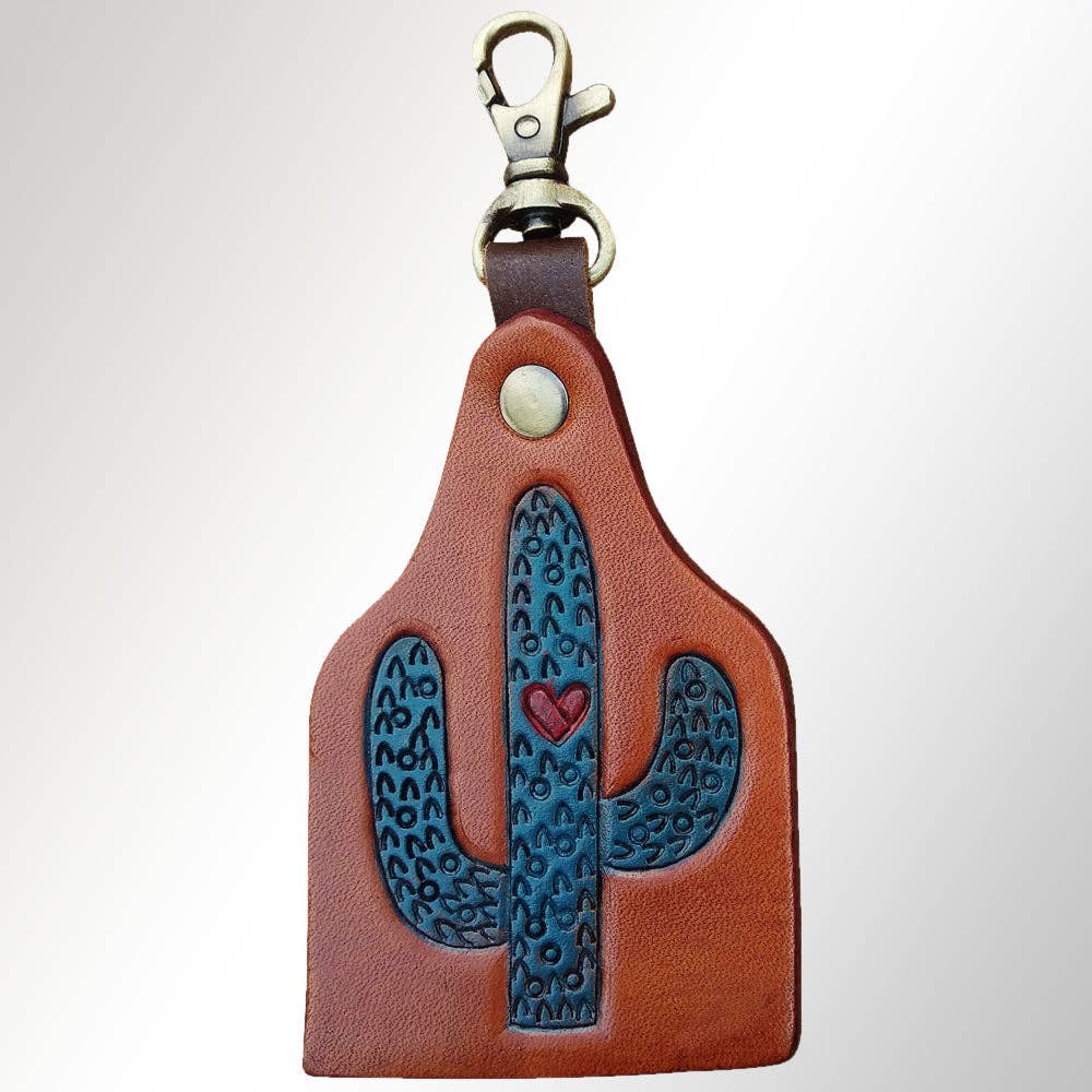 Add a pop of color and Southwest charm to your keys or bag with this vibrant hand-tooled leather keychain. Featuring a beautifully tooled cactus scene accented with sunflowers, blooming pink florals, and a bold turquoise motif, this key fob brings artistry and personality to everyday essentials. Perfect for cowgirls, Western lovers, or as a unique handmade gift. Features: * Premium hand-tooled leather * Colorful cactus, sunflower, and floral artwork * Bright turquoise accent design * Antique swivel clasp for easy attachment * Durable and lightweight