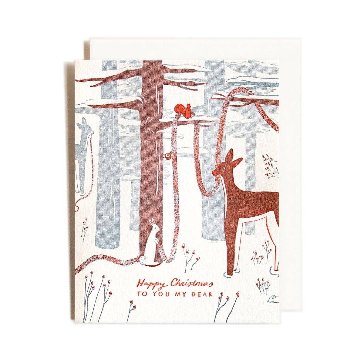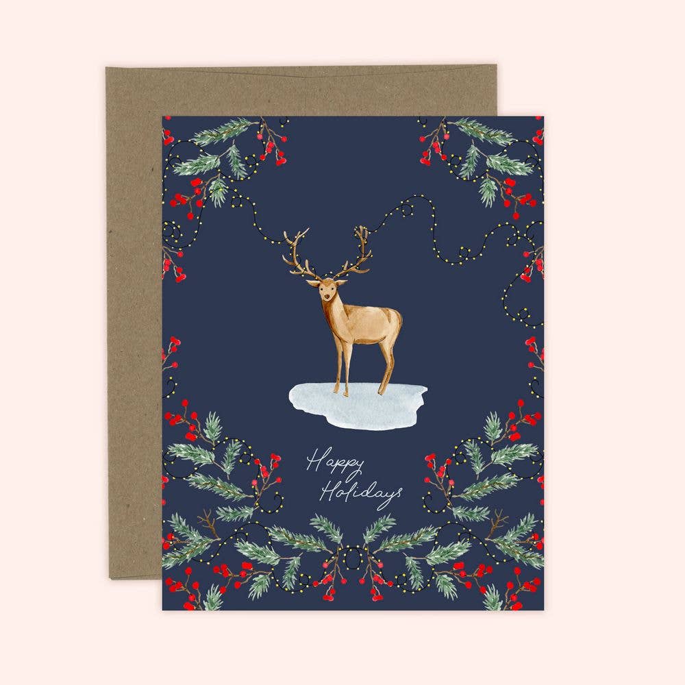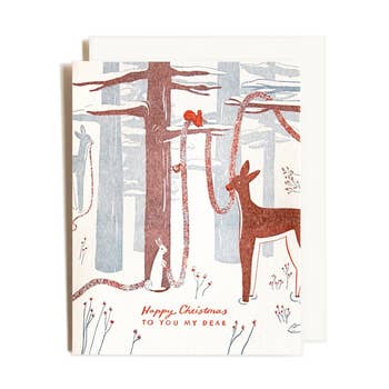 Holiday A2 card 4.25" x 5.5" Greeting Card cream colored paper with Matching Envelope in cello sleeve. Designed and printed in Portland OR. on an Indigo press with rich saturated colors. Our local printer uses partially recycled paper, soy ink and earth friendly practices. deer mouse w/mistletoe woodland creatures