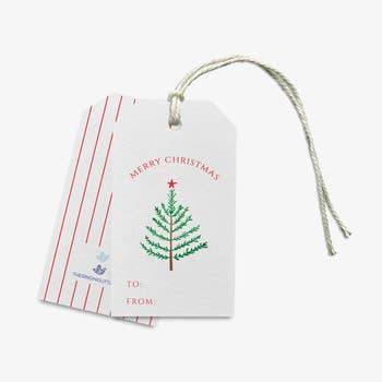 This listing is for the above pictured super cute gift tag set of 10!! Design is created and copyrighted by myself, Abbie Ren. DETAILS: * 2" x 3.5" each * Printed on thick cardstock with a soft finish and gold foiling. * Packaged in a set of ten. * Made in USA Pair with our Wonky Plaid Wrapping Paper: https://www.faire.com/product/p_4an0xlqbvq OR Rust Christmas Wrapping Paper: https://www.faire.com/product/p_83julef84h keywords: gold foil funny holiday gift present red christmas gift tags