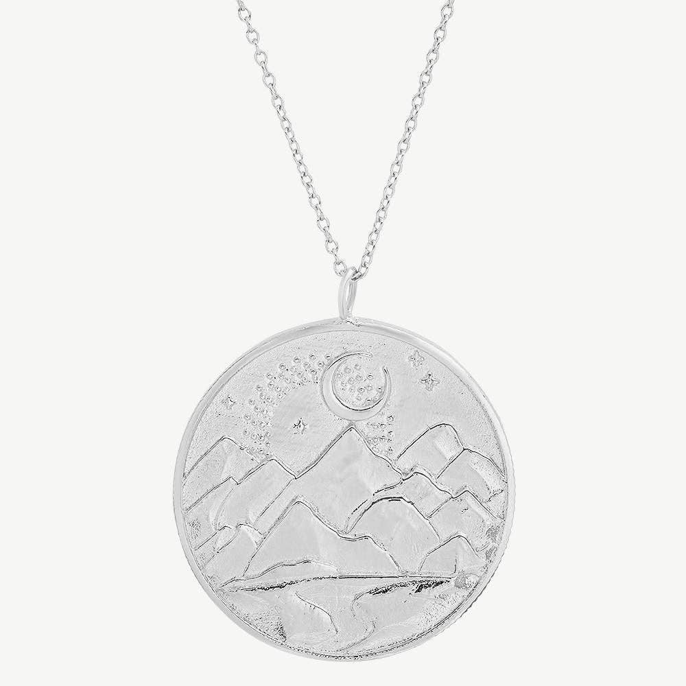 There's much to love about this snow cap mountain necklace. The crescent moon frames a mountain scene that celebrates the winter season and night sky. If you enjoy dark night skies with bright stars, and playing in the snow, then showcase your enthusiasm with this poetic mountain necklace. The contrast between the shiny silver & twinkle of the stars against the oxidized dark night skies is stunning. Silver version comes on a simple sterling silver 18" cable chain with a spring ring clasp, adjustable to 16". The charm measures 17x15mm, excluding jumprings. Gold tone version features a bronze charm on an 18" gold-filled chain and is not adjustable. ·        Made from Recycled or Reclaimed Sterling Silver. ·        Available in Sterling Silver & Bronze(with gold filled chain) • Lipped necklace cards will come free with every order. Please note that necklaces will not be pre-carded