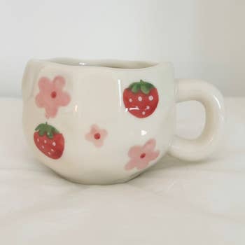 Handmade ceramic mug, thrown on the wheel and stamped with my handmade stamp. Glazed glossy white on the inside, lip, and handle. Strawberries are glazed a glossy red and green, and the rest is the natural clay. Dishwasher and microwave safe. Size guide: While some variation can be expected with handmade items, the sizes generally are: 8oz mug is 3 inches tall, 3 inch diameter. 12oz mug is 3.5 inches tall, 3 inch diameter. 16oz mug is 4.5 inches tall 3.5 inch diameter.