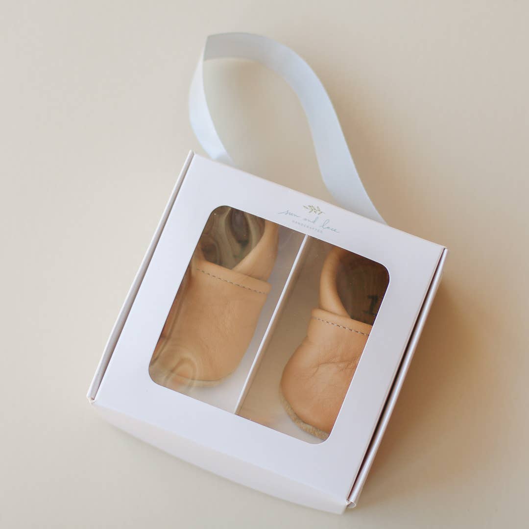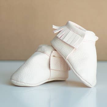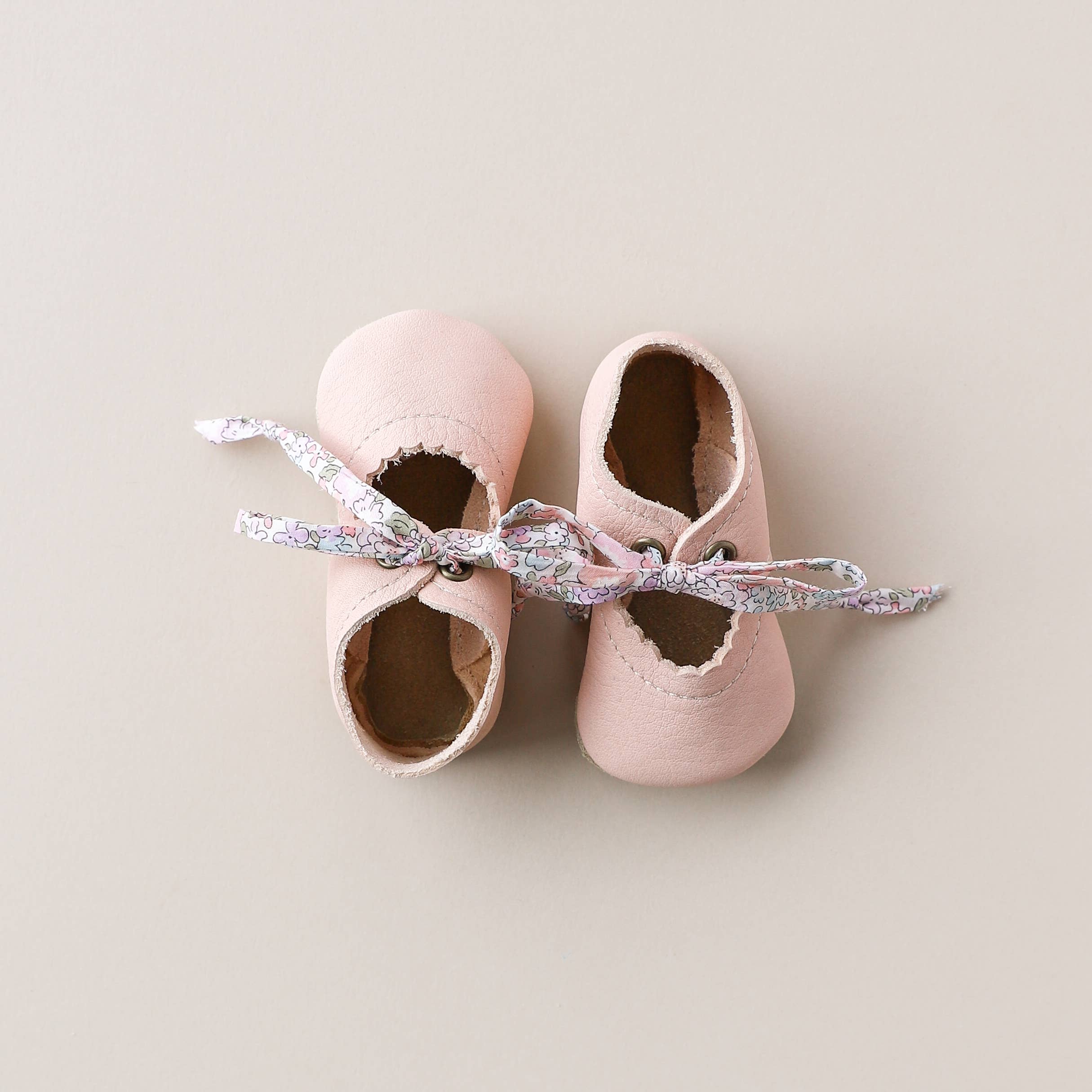 These light pink leather slip-on baby shoes are complemented by a sandy brown suede sole. Elastic around the ankles helps keep the shoes on securely yet comfortably. Ivory crochet trim adds subtle feminine detail. General sizing: 0 fits 0-3m 1 fits 3-6m 2 fits 6-9m 3 fits 9-12m Default presentation is shoes paired together with hangtag, or order display boxes here: https://www.faire.com/product/p_9huwckcxxs