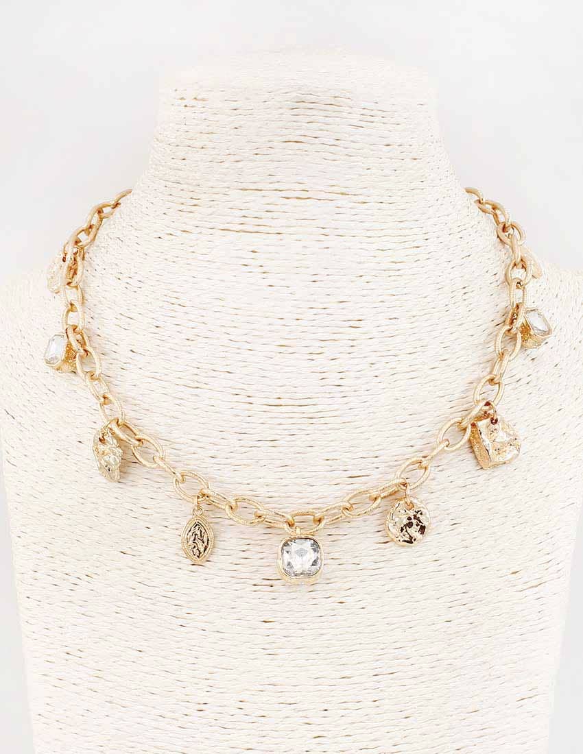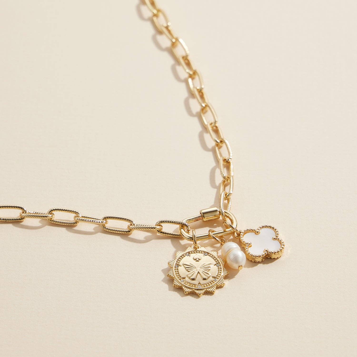 Charm Necklace - a stunning mix of charms, featuring a combination of Pearl, Heart, Turquoise, and Coin Charms on a stylish link chain. This necklace has blending the elegance of pearls with the vibrant touch of turquoise and the classic appeal of heart and coin motifs. Product details length: 16" charm size: varies .25" - .75" ext: 3" Ball Chain Ext clasp: Lobster Claw metal finish: Gold Plated product: Lead & Nickel Compliant anti-tarnish: Double E-coating