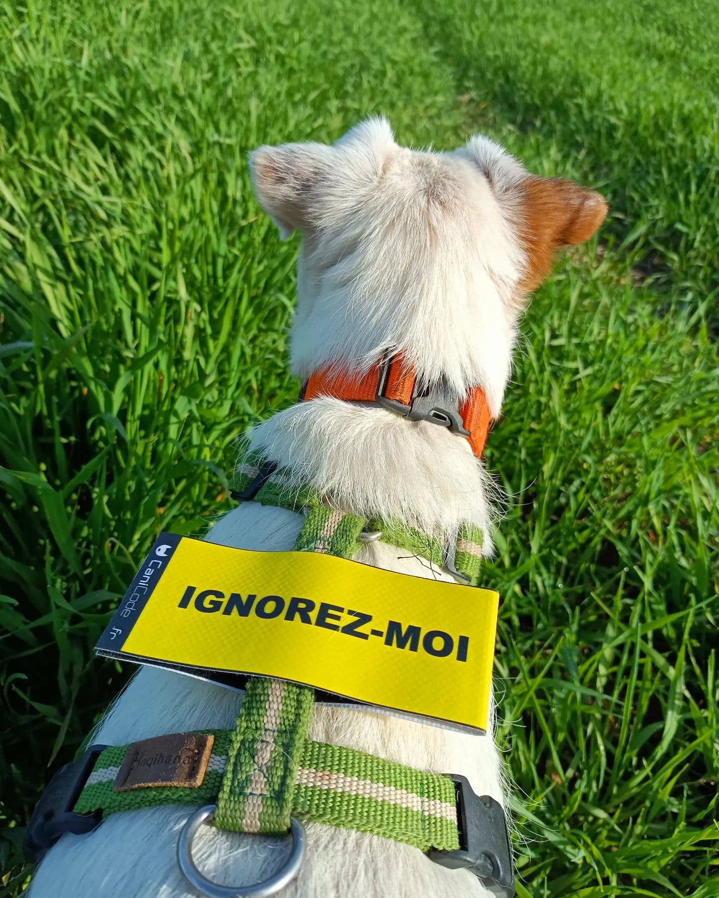 Preventive Scratch CaniCode® with color code and message. They are lightweight, made of highly resistant laminated material (do not tear easily and are rainproof). The double-sided model is suitable for all types of harnesses, leashes, or collars. All our CaniCodes have been handmade in Auvergne since 2016.