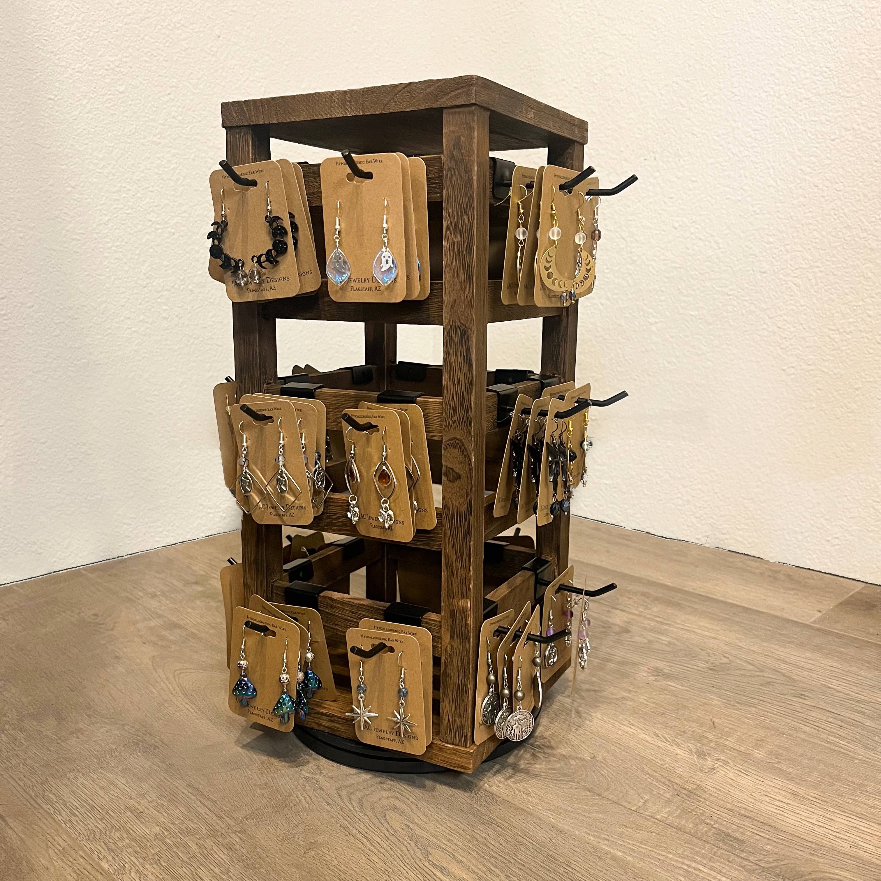 Beautiful two-sided wood display with spinner. This display fits 48 different styles with metal hooks. Free display and free shipping with $800 or more order.