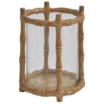 Gray wash Willow Wrapped Glass Votive Holder is a decorative votive holder that is set in a gray washed willow holder. Bottle is made of glass and the natural willow strips lend it a rustic finish that looks great in a variety of spaces. It is intended for votives and slim candles, but also looks fantastic filled with greenery and florals. Measures 3" high by 3.25" wide.