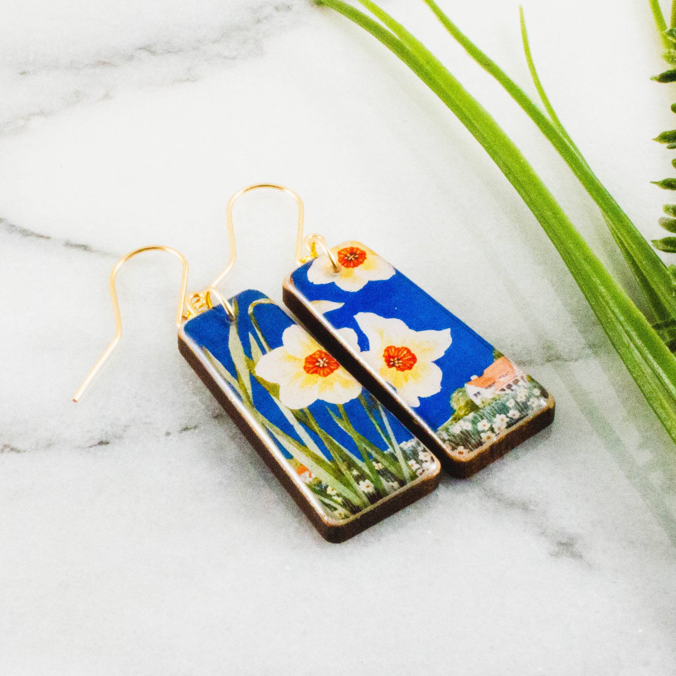 These delightful earrings feature a vintage Japanese crane scene, rendered in shades of tan and teal. Made from sustainably sourced North American hardwood and finished with soy-based, BPA/VOC free resin, these vibrant earrings will bring joy and brightness to any wardrobe. Handcrafted gold fill ear wires. Approximately 2.25 inches long.