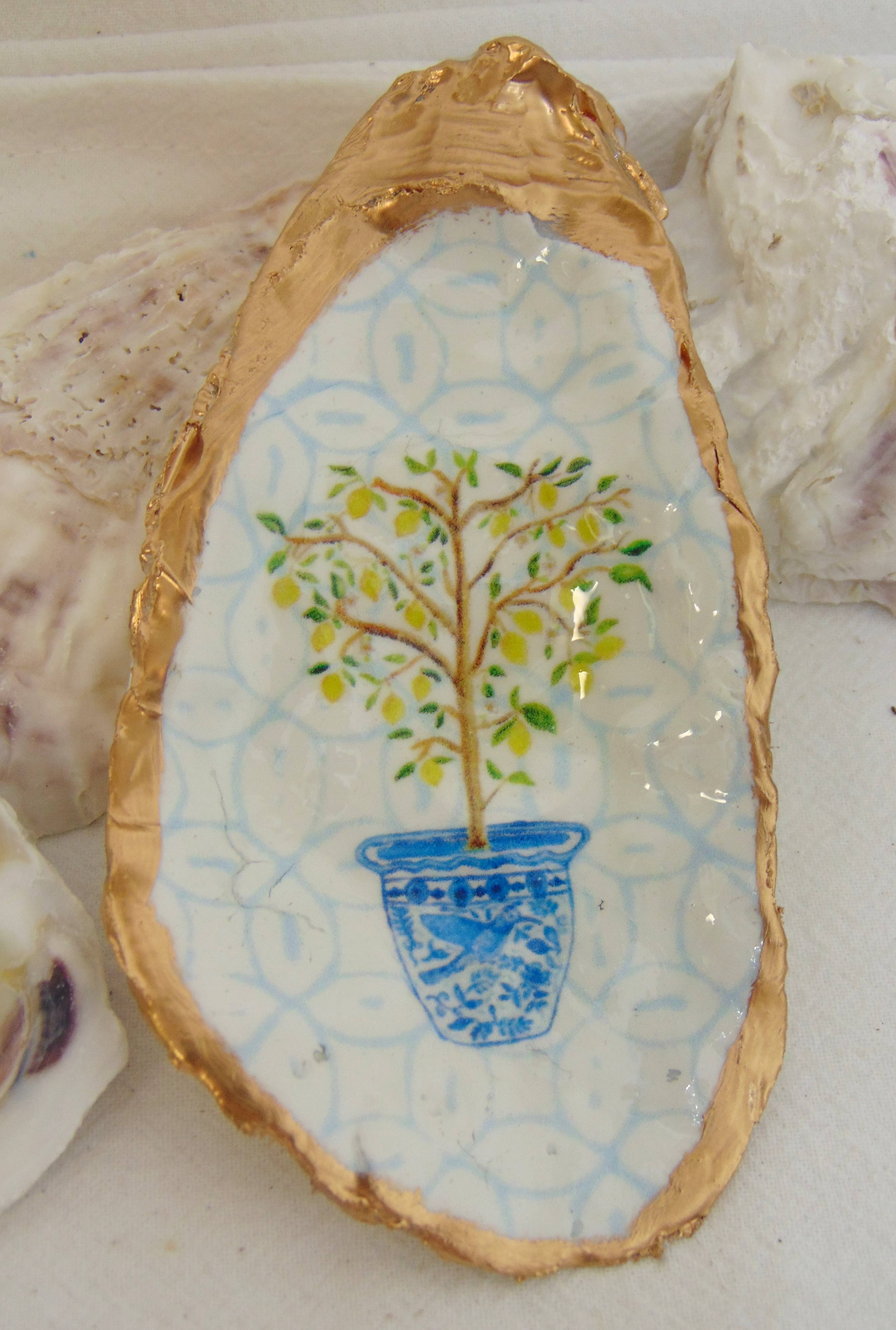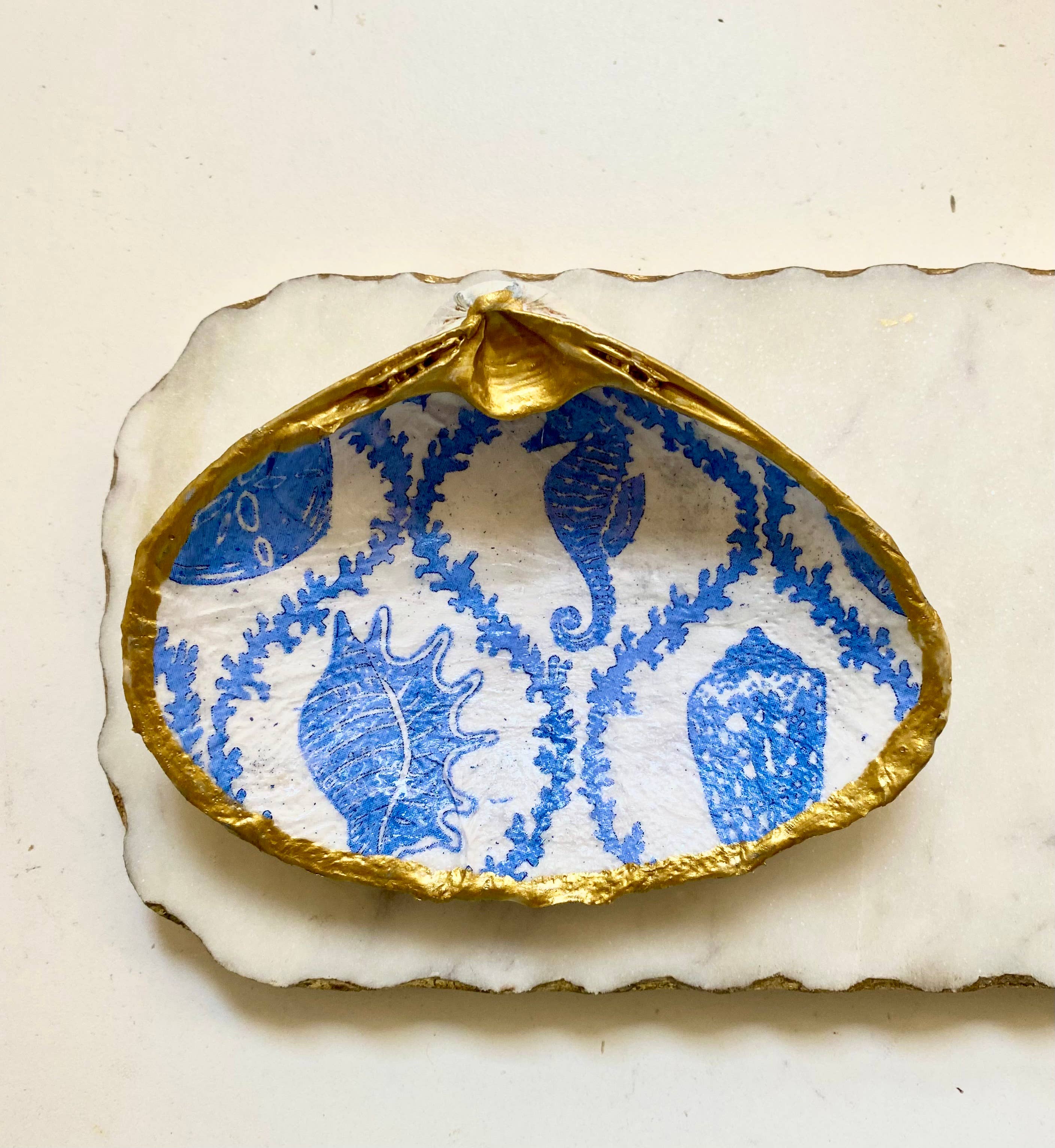 Shop our Oyster Shell Jewelry Dish Collection, a stunning fusion of elegance and sustainability. Each piece is meticulously handcrafted using oyster shells recycled from local restaurants around the DC area. The shells are decoupaged with tissue paper and hand-painted gold. Each shell reduces food waste in Washington DC, making them both beautiful and eco-conscious. Shells come in three sizes: Small: approx. 1.5-2 in. length Medium: approx. 2-2.5 in. length Large: 3+ in. length Features: 1. Recycled Oyster Shells: We partner with restaurants unable to sustain a formal recycling program for their shells. By repurposing these shells, we give them a new life and fight food waste. 2. Versatile Use: Our dishes can be used as decorative accents around your home. Display them on your vanity, dresser, or coffee table to add a touch of coastal charm to any space. 3. Thoughtful Gifts: the perfect unique gift for an eco-conscious individual, beach lover, or appreciator of handcrafted artistry