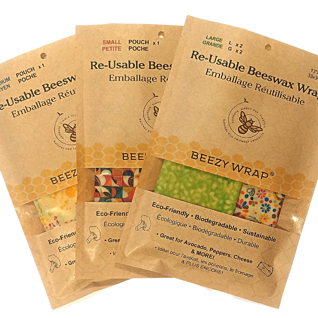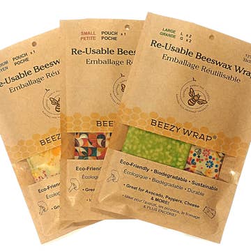 Reusable Beeswax Food Wrap by Meli Wraps. This 3 Pack of wraps includes one small (7"x7"), 1 medium (10"x10") and 1 large (10"x16") wrap in our new Purple Papaya print. Meli Wraps are used for food storage; a natural alternative to plastic wrap. Cover your food, plates, bowls with this reusable wrap, the beeswax coating makes the wrap stick to itself. Meli Wraps are made with organic cotton, beeswax, tree resin, organic coconut and jojoba oil. Washable and reusable for about a year.