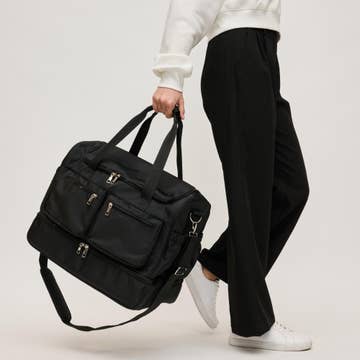 The Ranger XL 2 Duffel Bag is your ideal travel companion, blending style and functionality for all your vacations and getaways. With front quilting and a trendy charm bar, it features a soft-lined phone pocket with a magnetic closure, two magnetic side pockets, and a luggage trolley sleeve for effortless transport. Inside, a built-in RFID wallet securely holds six cards, while a key ring bungee cord, two pen holders, a Clearview zipper pocket, and multiple cargo pockets keep everything organized. Equipped with a top handle, a back zipper pocket, and a durable design, the Ranger XL is perfectly prepared for all your packing needs! Dimensions: 11.5"W x 14"H x 9.5"D Weight: 1.75 lb Strap Length: 28.5" to 55" Shoulder/Strap Drop: 12.5" to 26" Top Handle Drop: 2" Strap Width: 1.5" Exterior Features: Lug Charm Bar - Lug Charm sold separately Signature soft-lined phone pocket with magnetic closure Two magnetic closure side pockets Two large D-rings Top handle