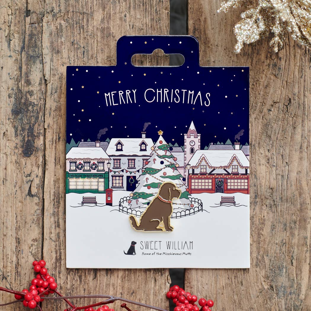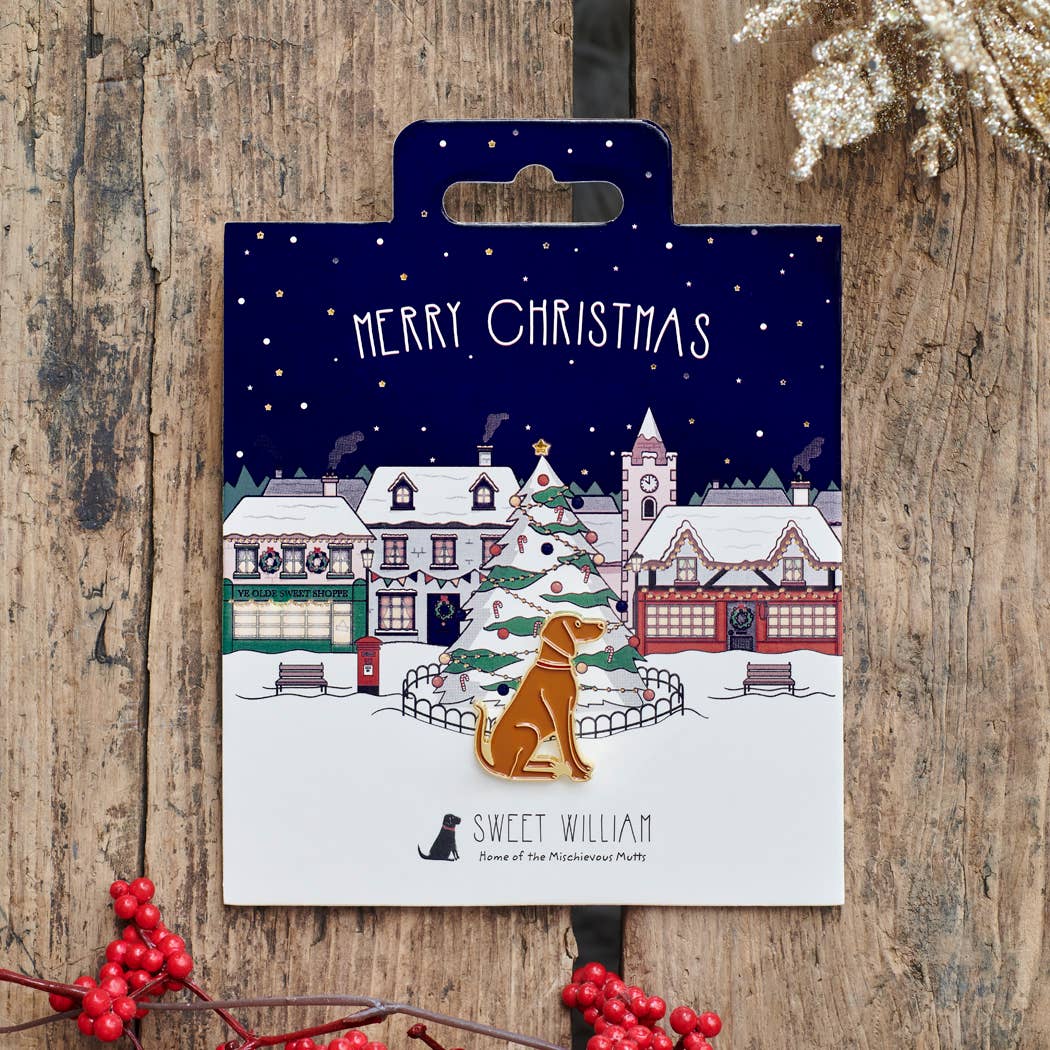 A beautiful, gold-plated enamel Fox Red Labrador dog pin presented on a festive backing card. Featuring a gold metal fastening to attach the pin to a coat, bag or scarf. Presented on a sturdy backing card depicting a typical British village at Christmas. Perfect as stocking fillers or secret santa gifts. Poem on the reverse of the card reads: Here's a little pin so they are always kept near, pinned to you wherever you go, at this most wonderful time of the year!