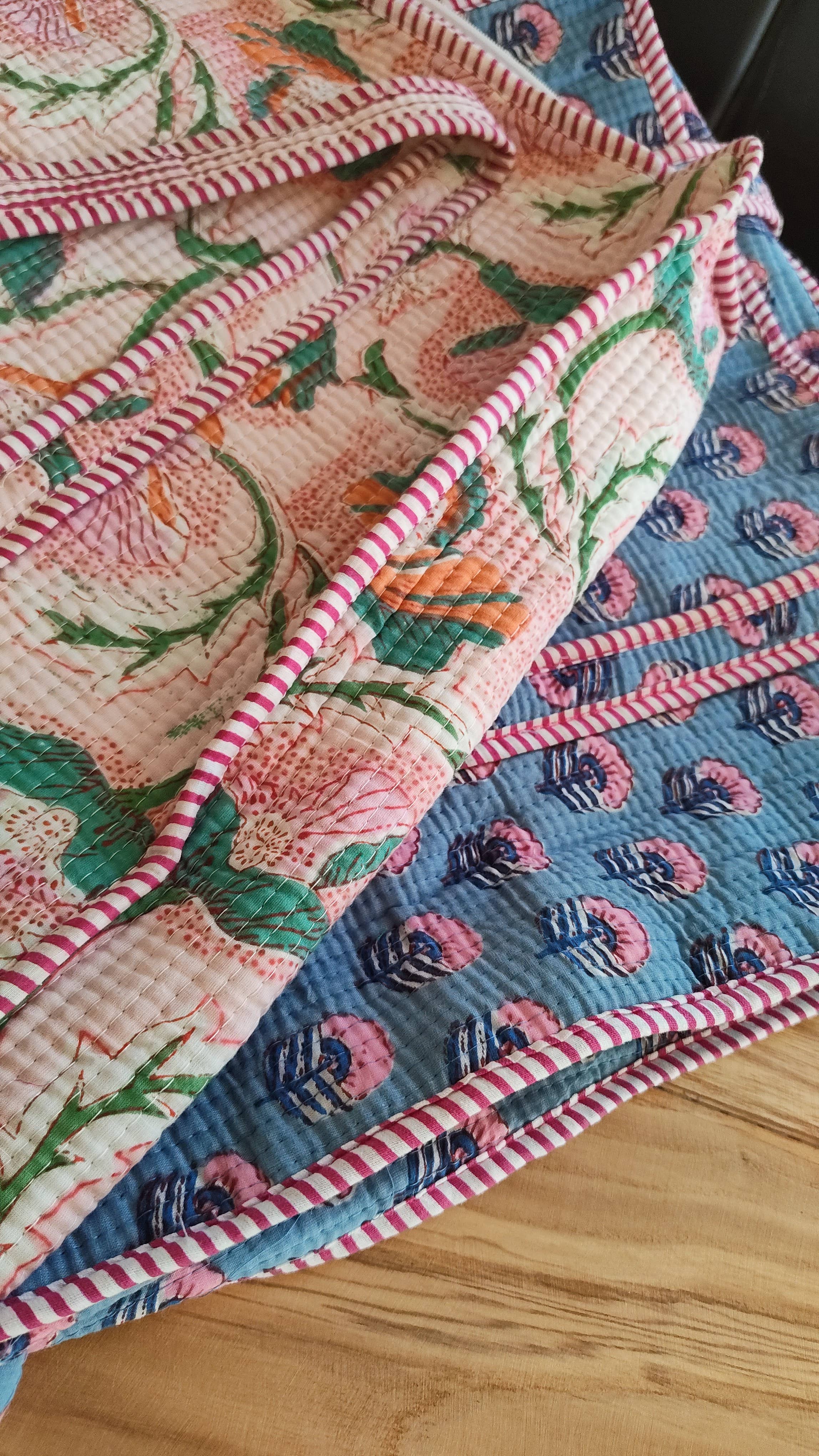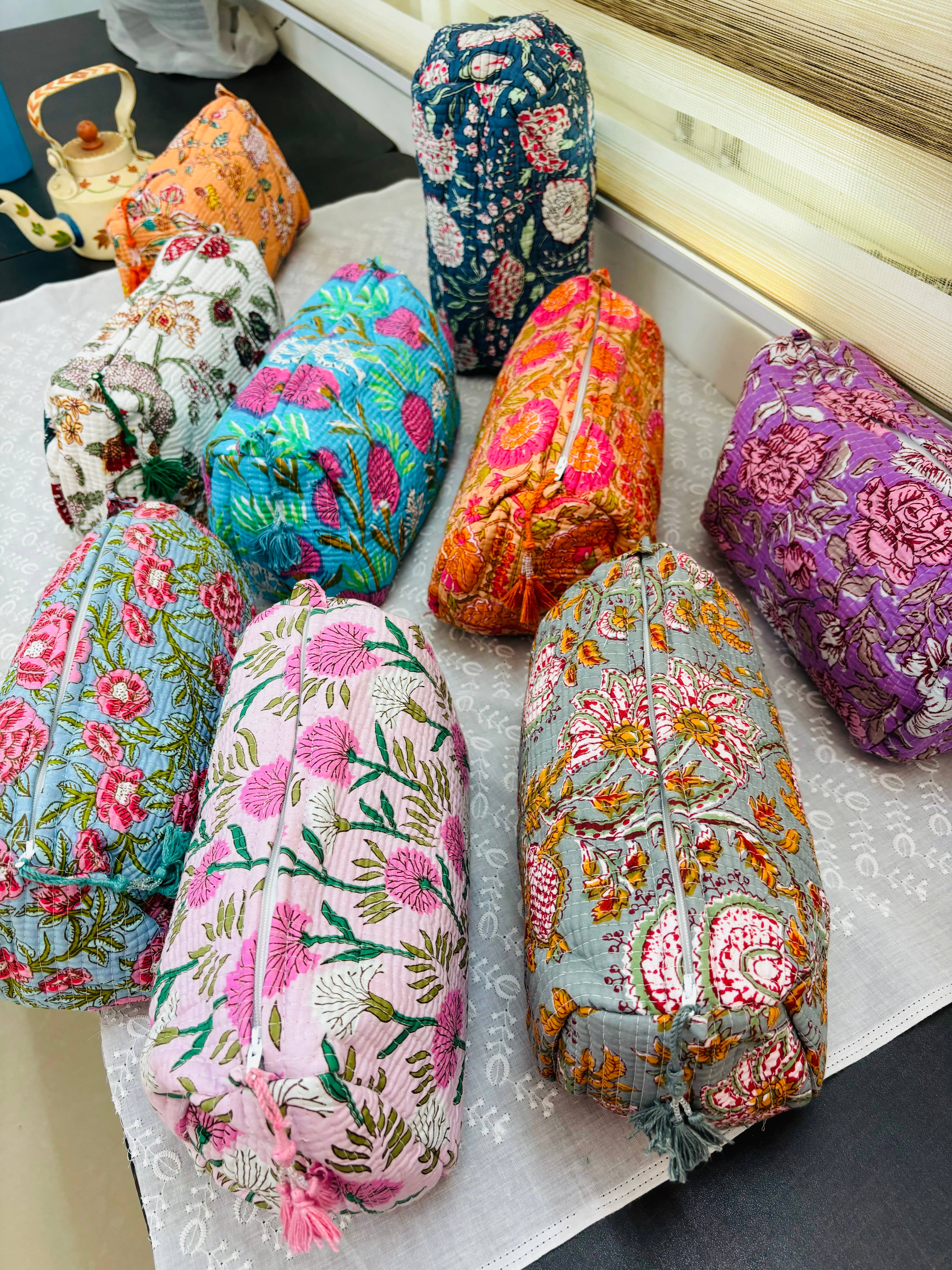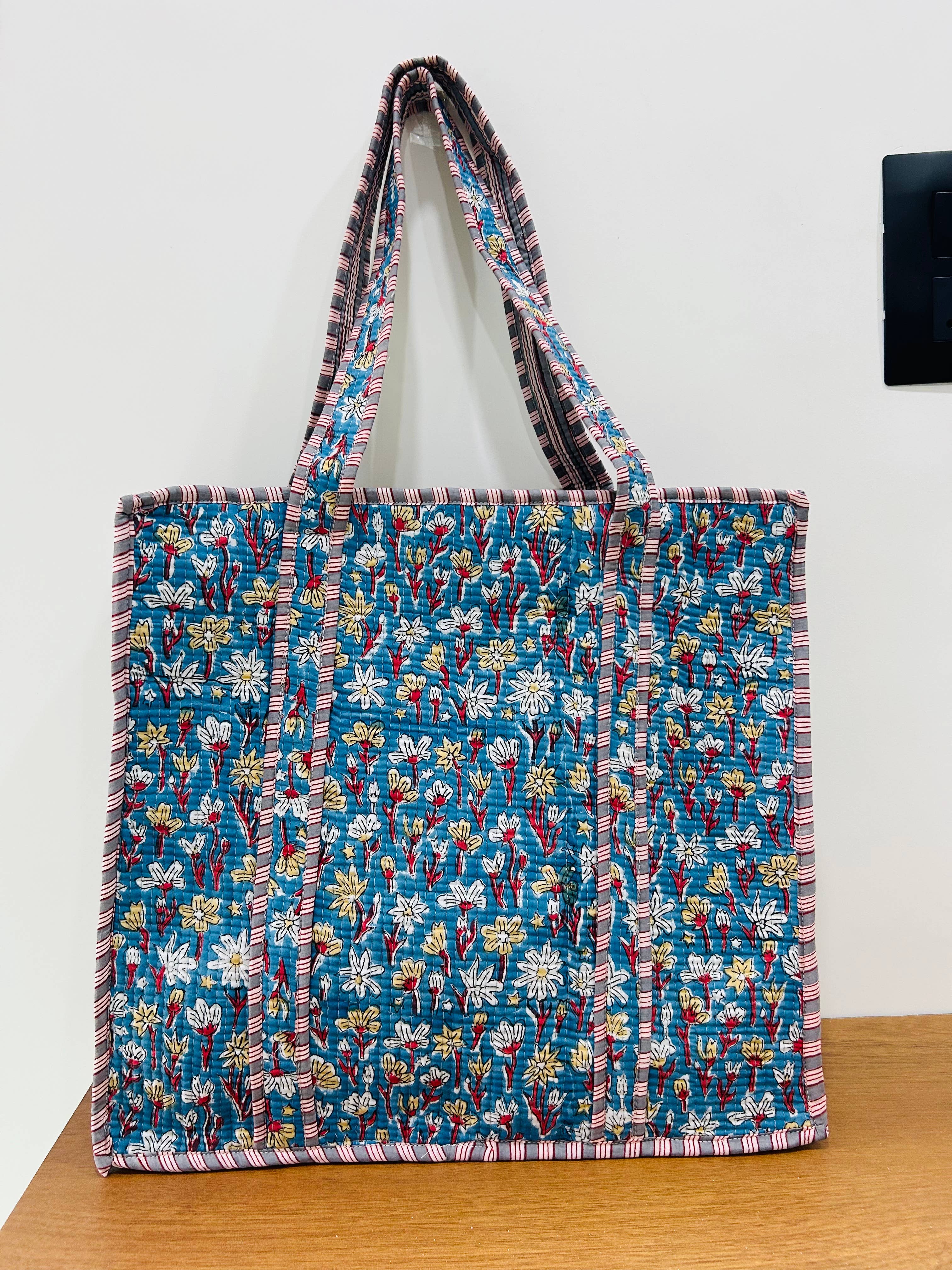 Assorted Mix Designer Floral Printed - Quilted block print, oversized reversible tote Bags. Perfect for a market tote, beach bag, weekender Bag, Shopping bags and much more! Handmade in small batches, prints are very limited. Interior pocket 18" x 18" With Handle Cotton block printed fabric 100% Made In India Collections - Our quilted totes are handmade by Indian artisans, so there may be some irregularities and the print placement may vary by bag.