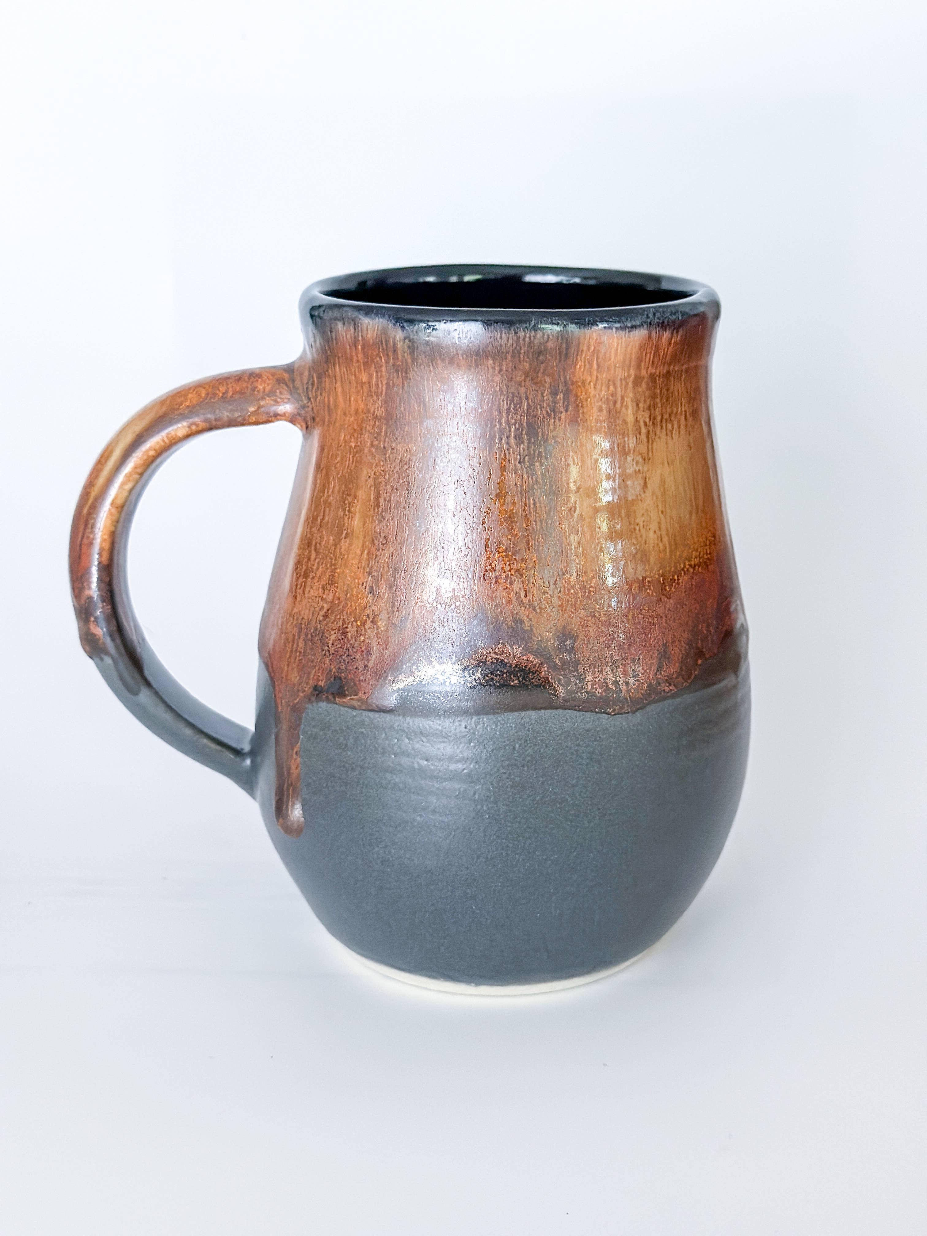 Our signature mug! The angled mug fits in your hand perfectly whether you like to grasp from the handle or cup with both hands using the angled groove. Each mug is hand thrown on the wheel making each angle unique! All pieces are High Fire Stoneware Handmade in Los Angeles by Olivia Snow Norman Available in 5 colors :Dark Brown: Satin Walnut Glaze Interior/ Dark Brown Stoneware Exterior Stone White: Glossy Creme glaze Interior/ Stone White Stoneware Exterior Brown:Glossy white interior/Brown stone ext. Cornwall Stone: Matte Cornwall Speckled Glaze for the Interior and Exterior Matte Grey: Matte gray Interior/exterior Approximately 4.25"x4" Each piece is made by hand, and therefore the size and shape will vary slightly from the photographs. Food safe. Microwave Safe. Hand wash is recommen Made to Order. Each piece is made by hand, and therefore the size and shape will vary slightly from the photographs. food safe. microwave safe and dishwasher safe. hand wash is recommended.