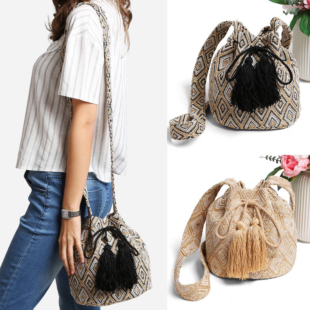 Colorful & unique crochet bags for fashion lovers! The Stripes are always classic and fashionable. Very lightweight, durable and comfortable to carry on. Wear it as a cross-body or shoulder bag. This stunning boho chic style bag is perfect for a casual day, as a beach/pool accessory or as a complement to your sports outfit. Details: * Bucket Style Hand Crocheted Bags * Premium (P): One-thread crochet technique, ultra light (0.75 lb) * Special Edition (SE): Two-thread crochet, 1.2 lb * Special and unique patterns. * Matching one-thread hand-loomed strap with zig-zag pattern * Premium Drawstrings and Special Tassels (some with Crochet decoration as showed in their pictures) * Material: Acrylic. * Overall dimensions (approximate): Boby: 11” H x 9” W x 9" D; Strap: 2.5” W, 22" Drop.