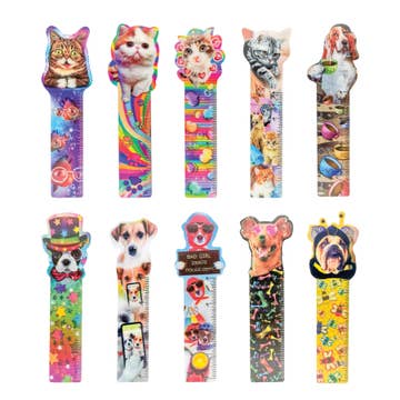 Awesome bookmarks with a 3-D effect and a 4” ruler printed on each. 10 different designs featuring silly and cute dogs and cats. Coated paper.