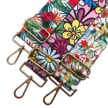 Floral straps are perfect for. the Spring & Summer or that tropical retreat or vacation. Add a bunch of flowers and brighten your handbags possibilities. Width: 2 inches Adjustable Length: 30 to 53+/- inches Available Hardware Finish: Gold, Silver, Gunmetal and Antique Brass