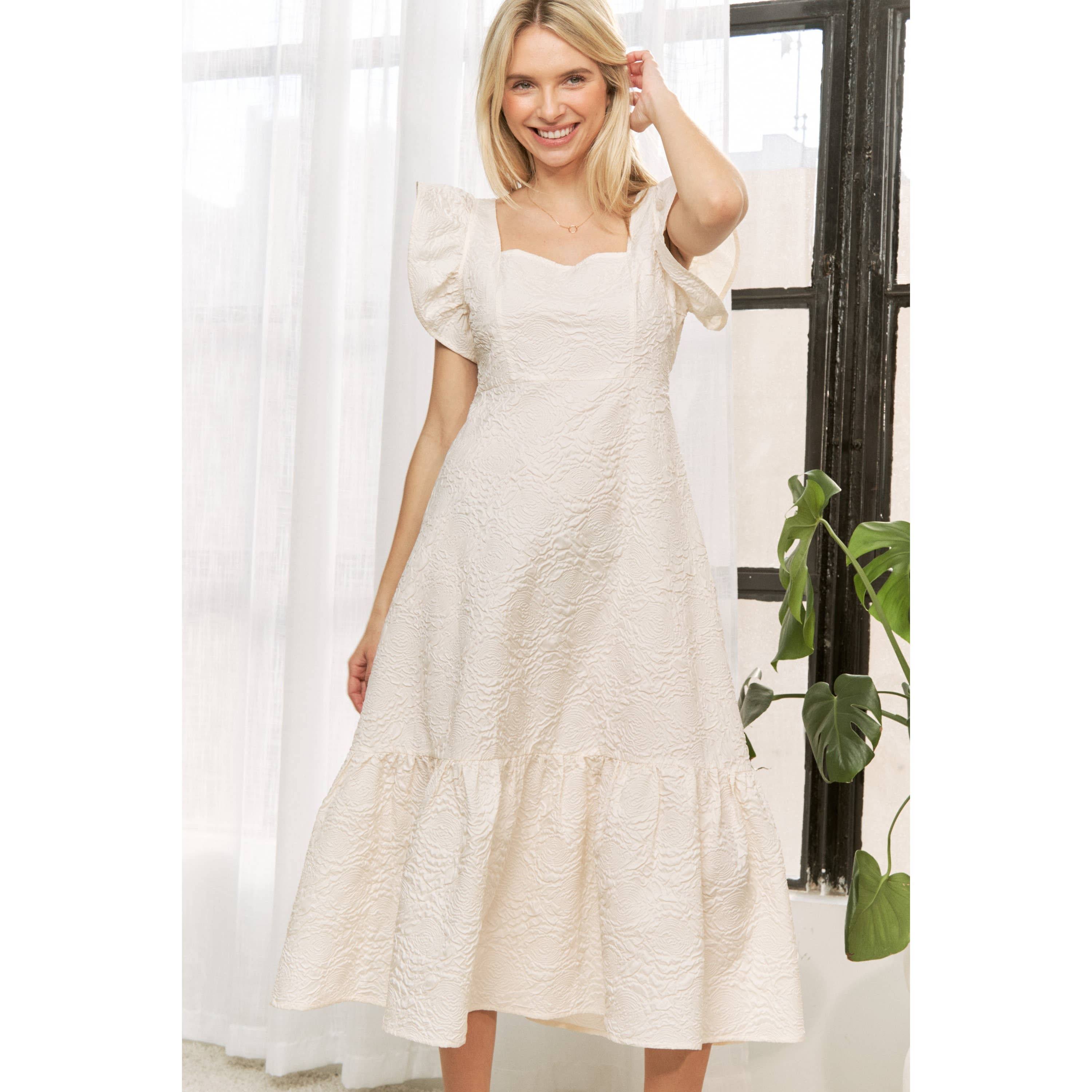 EMBOSSED SQUARE NECK BABYDOLL DRESS 100% POLYESTER SIZE S (2) - M (2) - L (2) MADE IN CHINA MODEL IS WEARING SMALL, 5' 10" 33 - 25 - 34