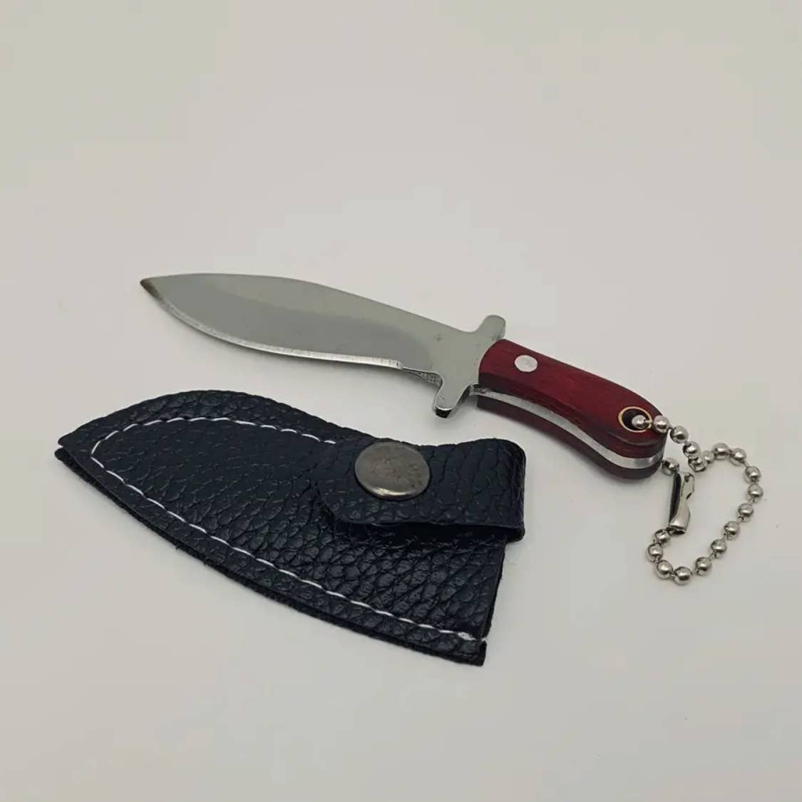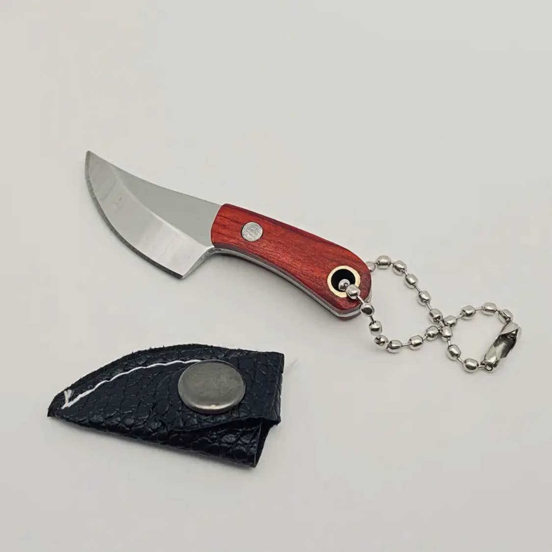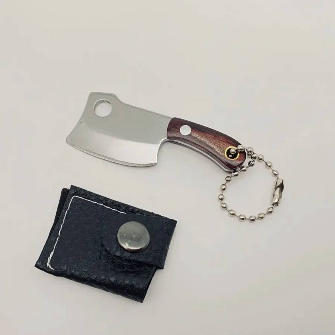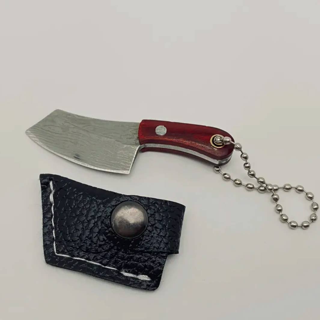 Material: Knife: stainless steel, length - 1.01inch Handle: wood, length - 1.27inch Cover: PU leather The axe is very sharp and has a keychain, making it suitable for carrying around and cutting things