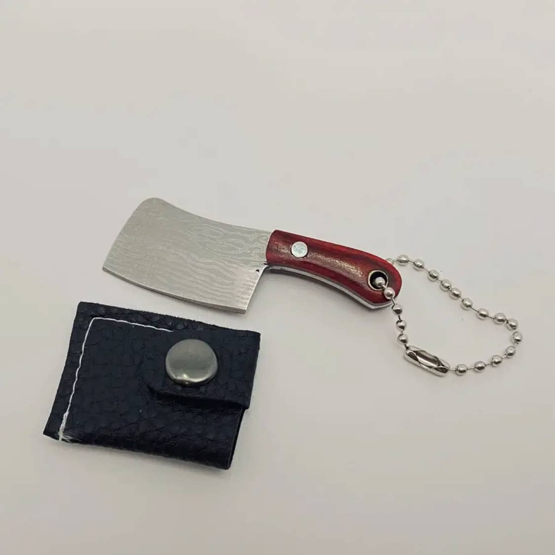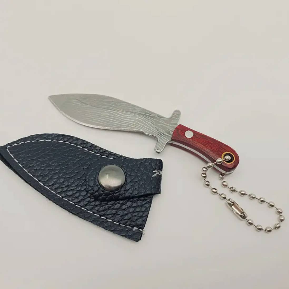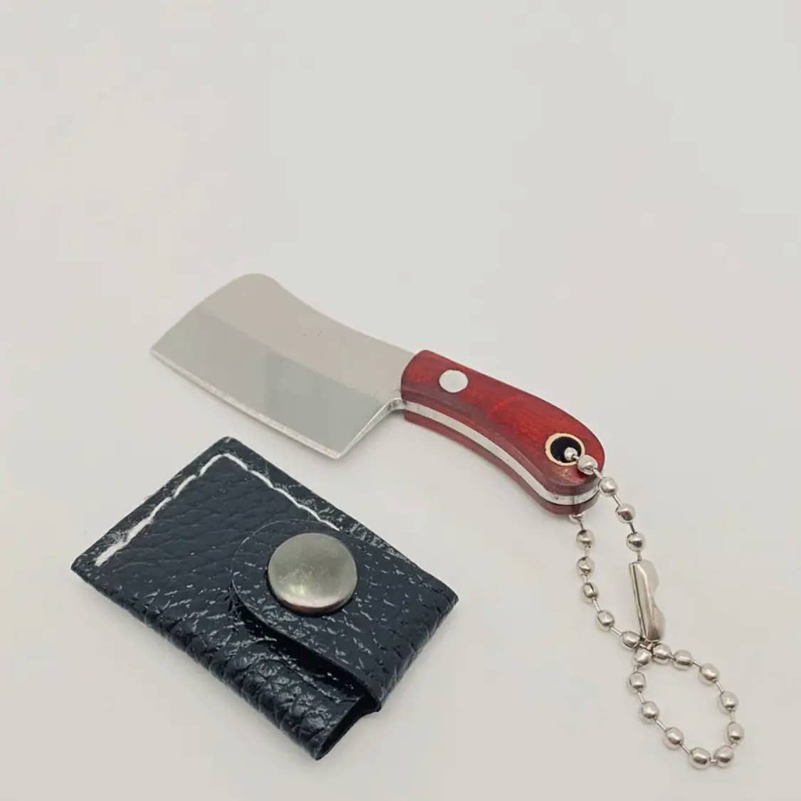 Material: Knife: stainless steel, length - 1.01inch Handle: wood, length - 1.27inch Cover: PU leather The axe is very sharp and has a keychain, making it suitable for carrying around and cutting things