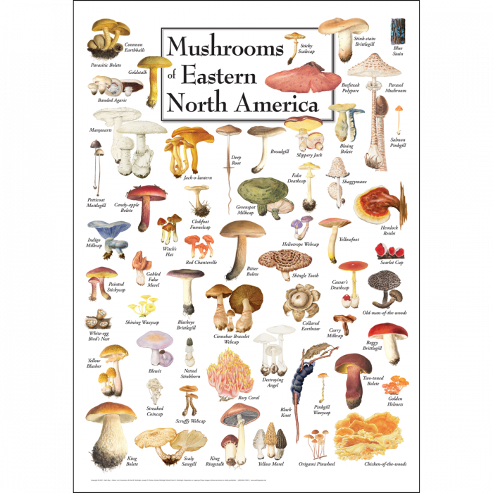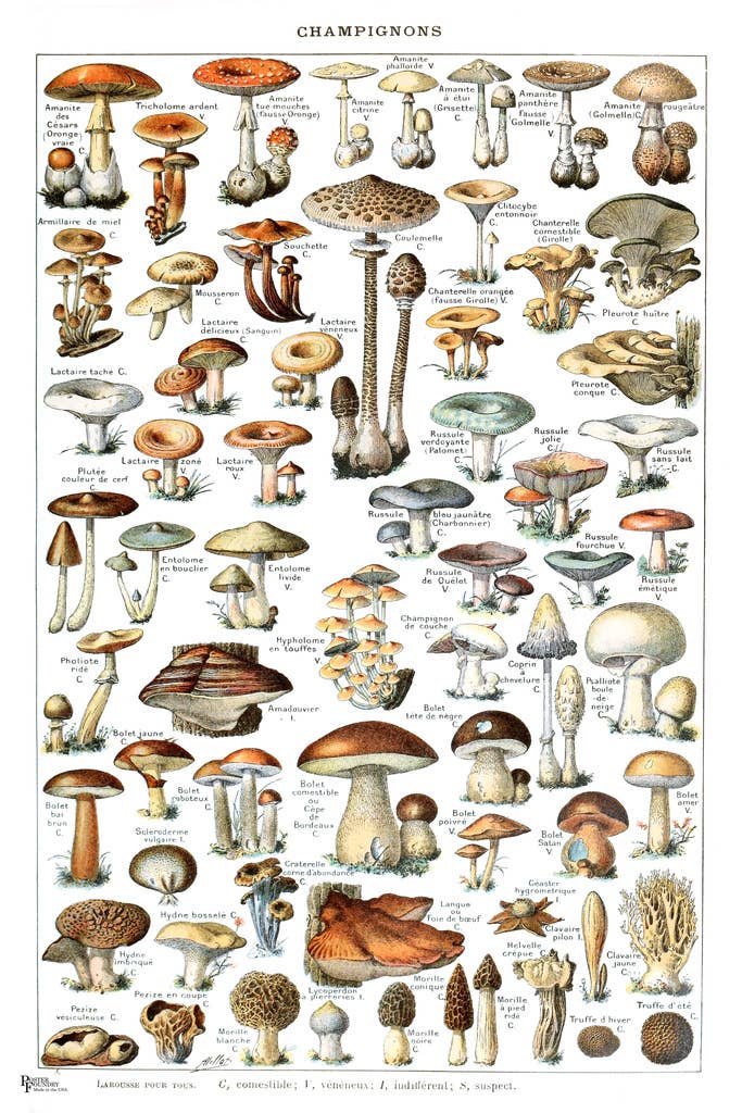 A 11"x17" colour Risograph poster replicated from a vintage field guide entitled "Mushrooms: what the fuck are they? At least tell me their damn names.” Printed on "speckletone" matte warm white cover stock, This is an essential resource for the novice mycologist!